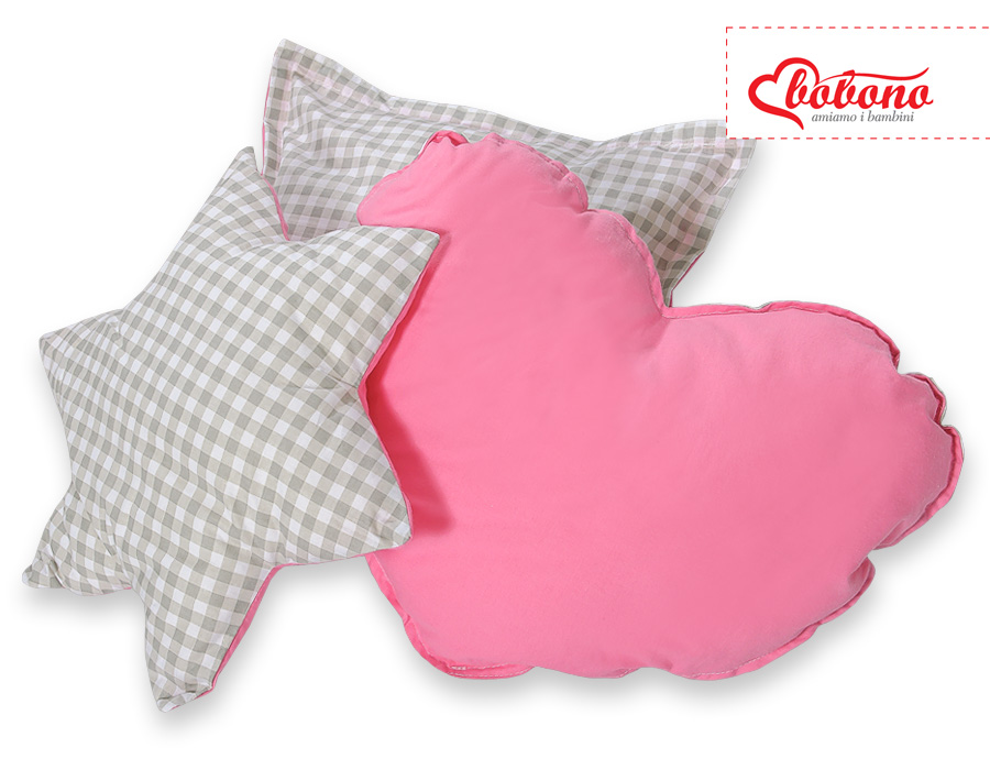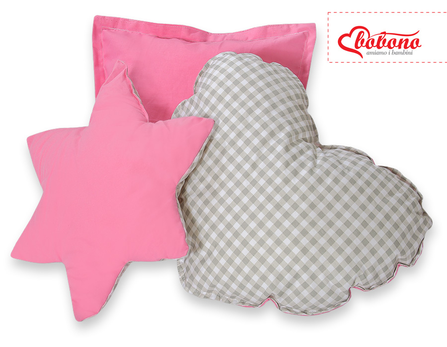 Bløde, fluffy puder, der matcher teltfarven. Hver pude i forskellig original, dekorativ form. Puder er tofarvede - hver side lavet af forskelligt materiale. Også perfekt som en farverig dekoration til børneværelset.