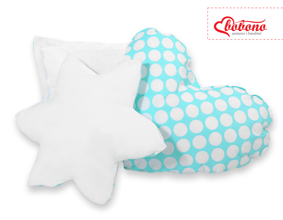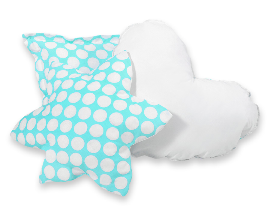 Bløde, fluffy puder, der matcher teltfarven. Hver pude i forskellig original, dekorativ form. Puder er tofarvede - hver side lavet af forskelligt materiale. Også perfekt som en farverig dekoration til børneværelset.