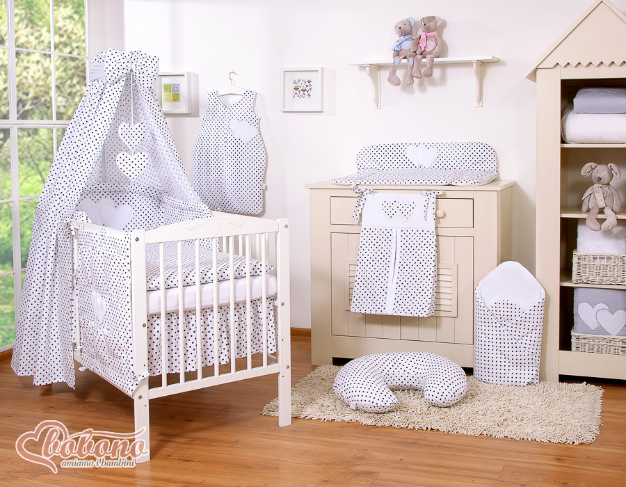 Baby sengehimmel lavet af bomuld for tremmeseng - Hanging Hearts  Sort Polkaprikker BomuldBaby sengehimmel lavet af bomuld for tremmeseng - Hanging Hearts  Sort Polkaprikker Bomuld