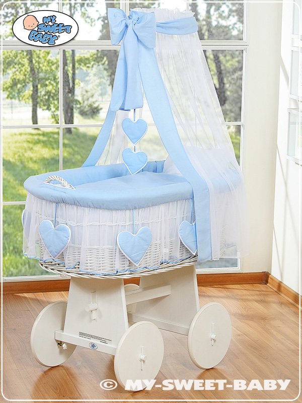 Hjemmeside » Kurvevugge » Flettet vugge på hjul med sengehimmel » Flettet vugge på hjul med sengehimmel » Babykurv med gardiner Blå Amelie