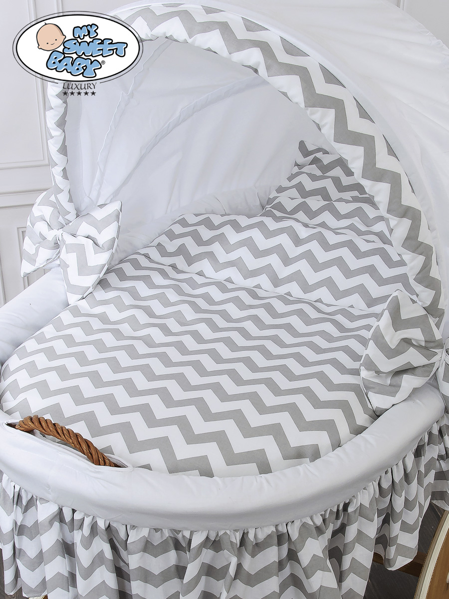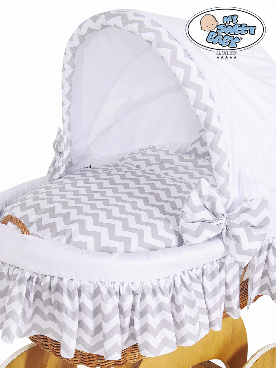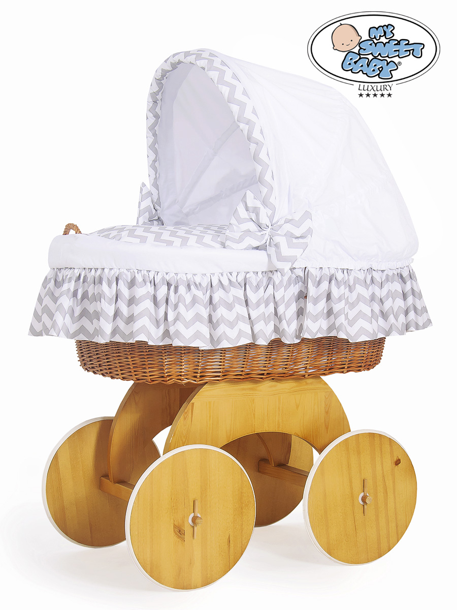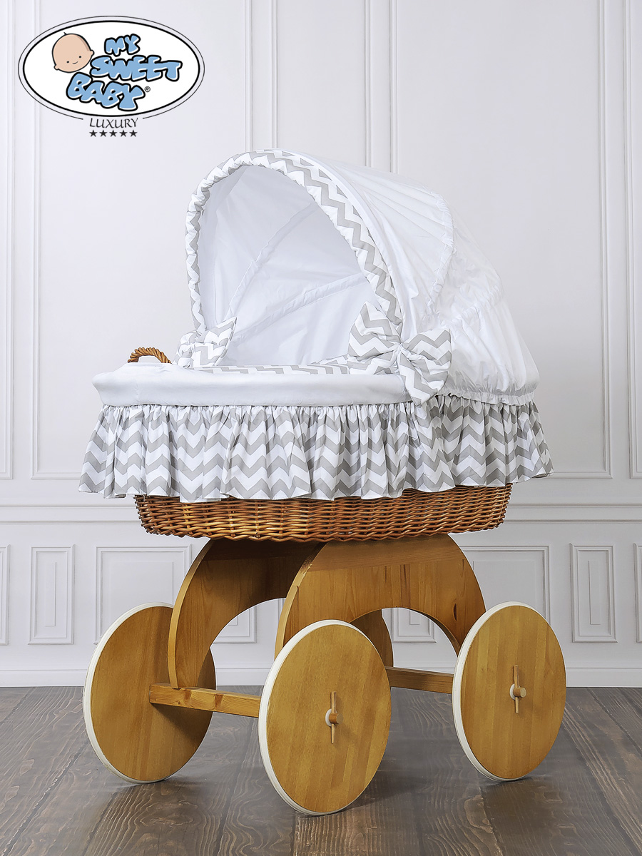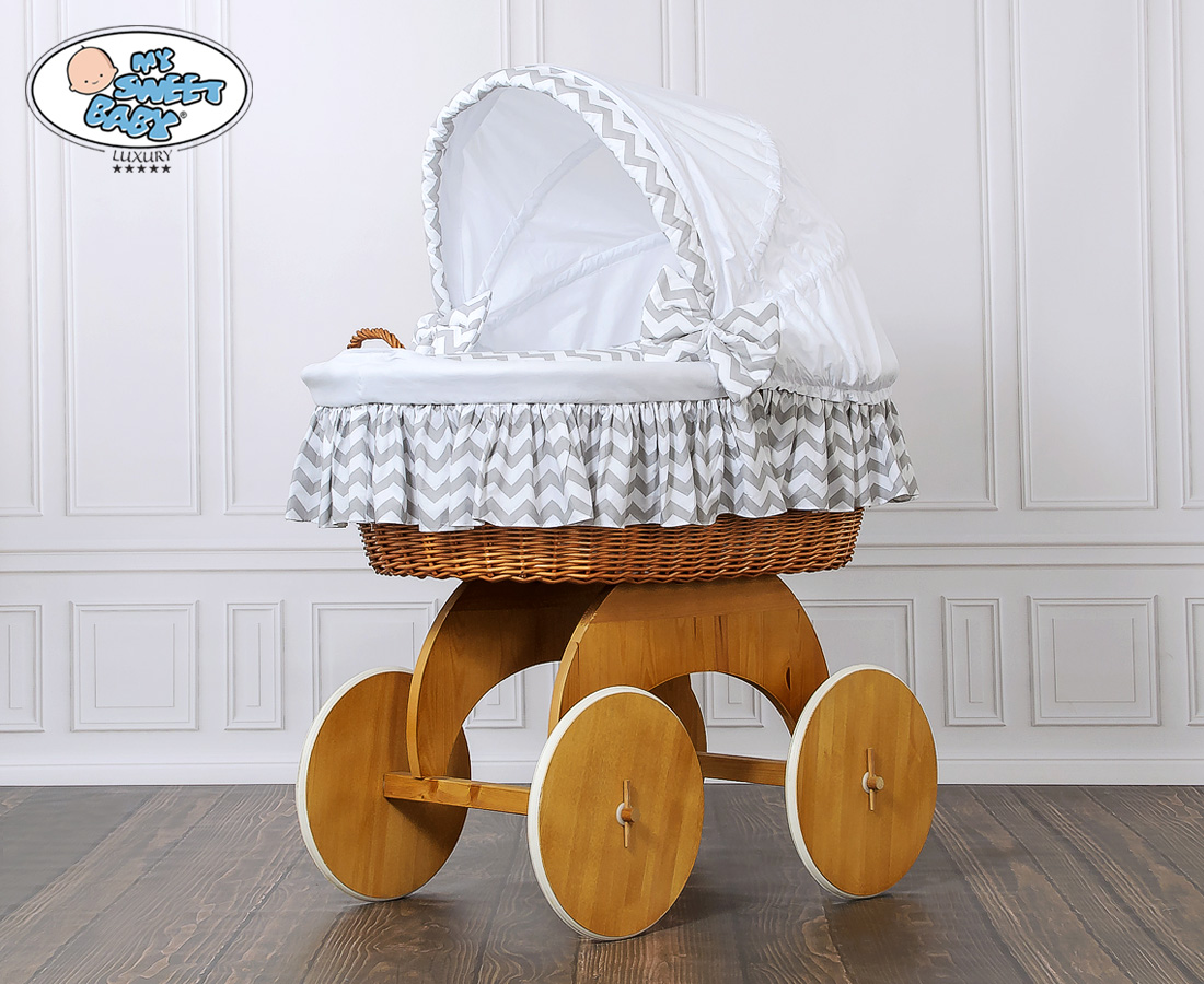 Hjemmeside » Kurvevugge » Babyvugge My Sweet Baby Luxury » Babyvugge med Kaleche » Babyvugge med Kaleche » Babykurv med hjul naturlig vidje og træ kaleche Hannah Blåt-Hvidt Zigzag Sengesæt Hvid Grå Hannah