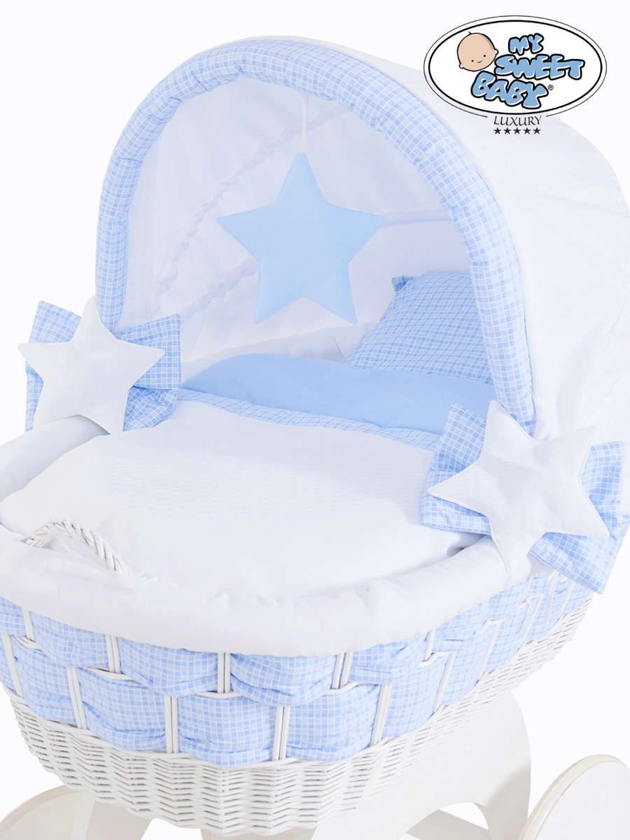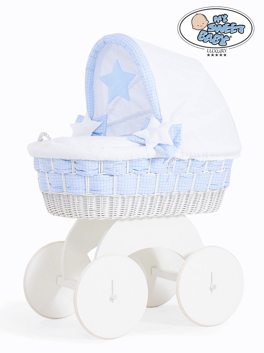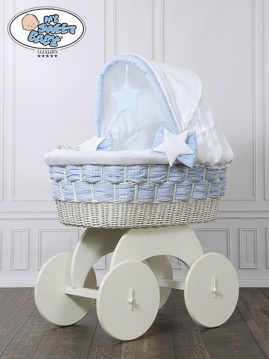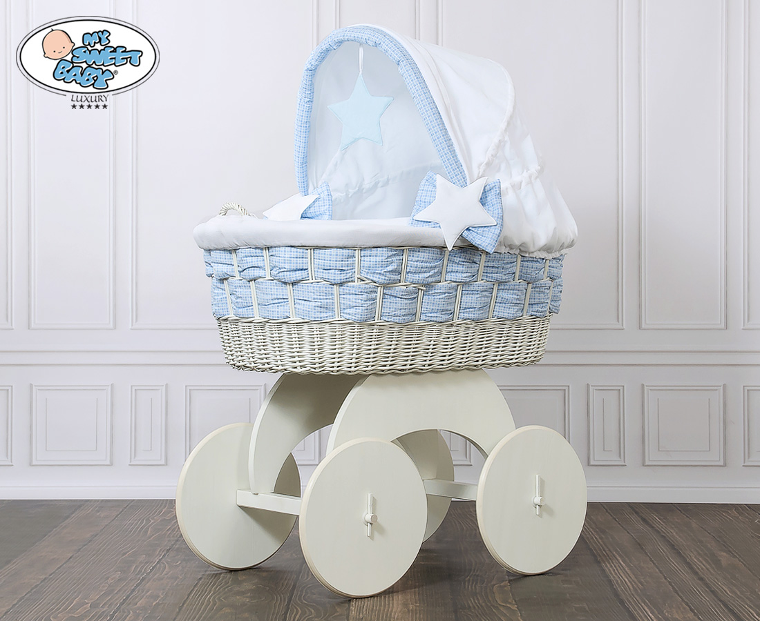Hjemmeside » Kurvevugge » Babyvugge My Sweet Baby Luxury » Babyvugge med Kaleche » Babyvugge med Kaleche » Babykurv med hjul naturlig vidje og træ kaleche Hannah Blåt-Hvidt Zigzag Sengesæt Isabella