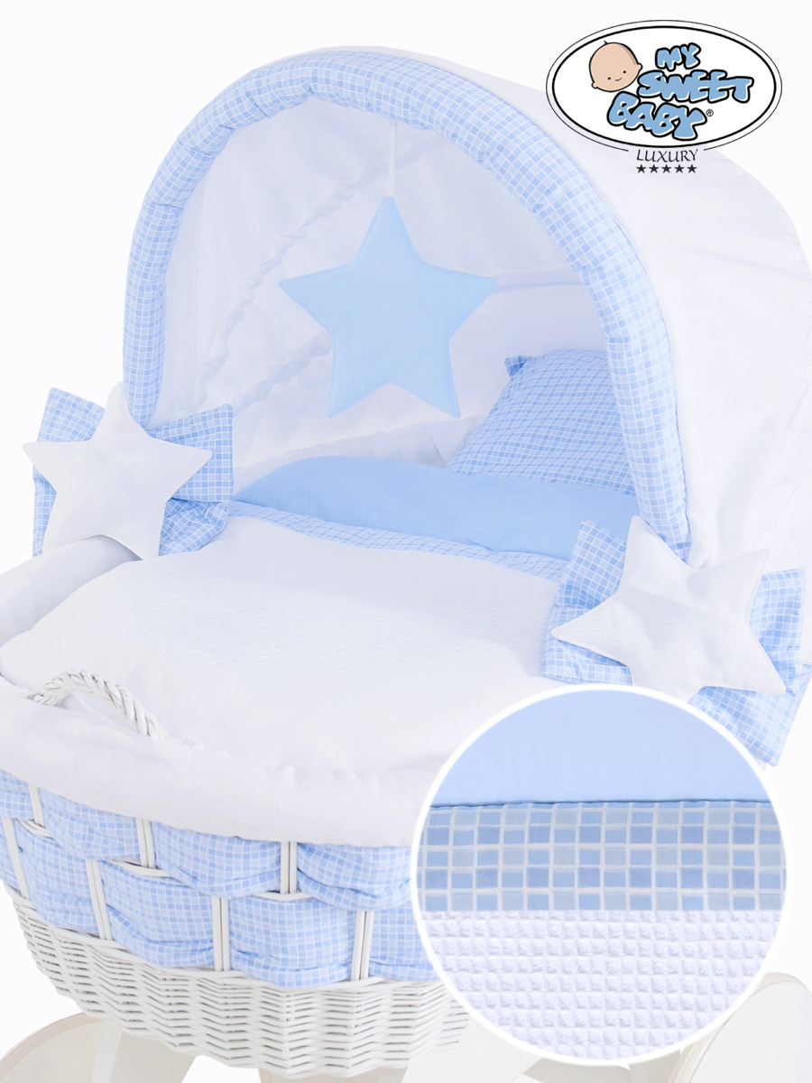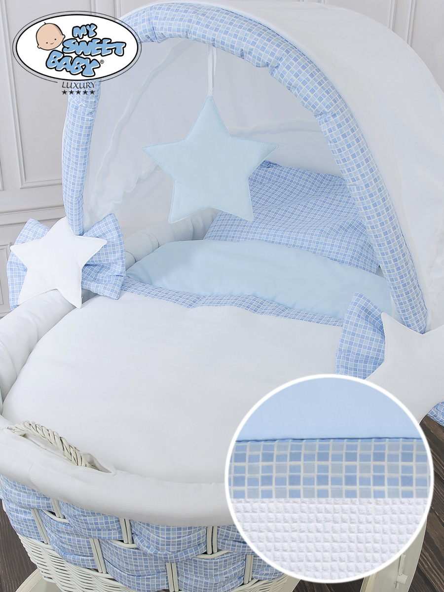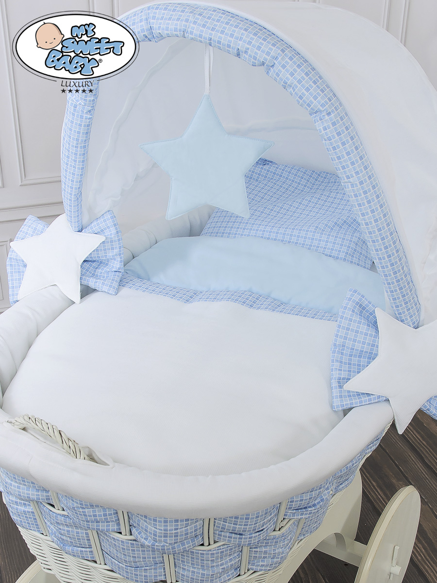 Hjemmeside » Kurvevugge » Babyvugge My Sweet Baby Luxury » Babyvugge med Kaleche » Babyvugge med Kaleche » Babykurv med hjul naturlig vidje og træ kaleche Hannah Blåt-Hvidt Zigzag Sengesæt Isabella