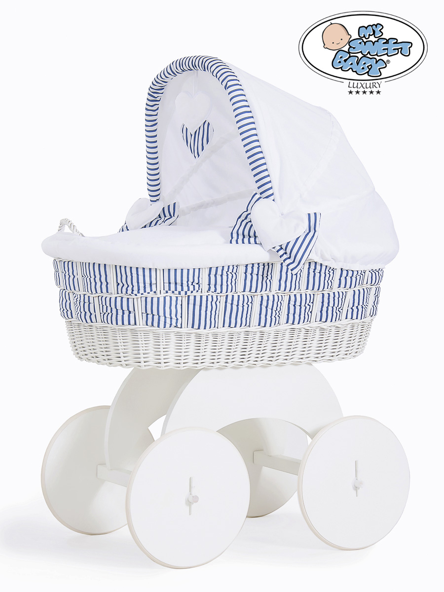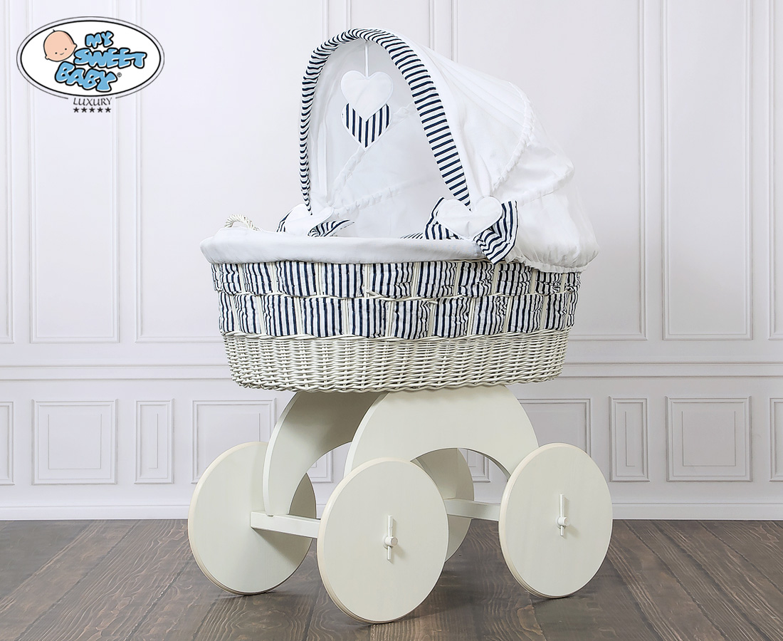 Babykurv med hjul naturlig vidje og træ kaleche Hannah Blåt-Hvidt Zigzag Sengesæt  Marina