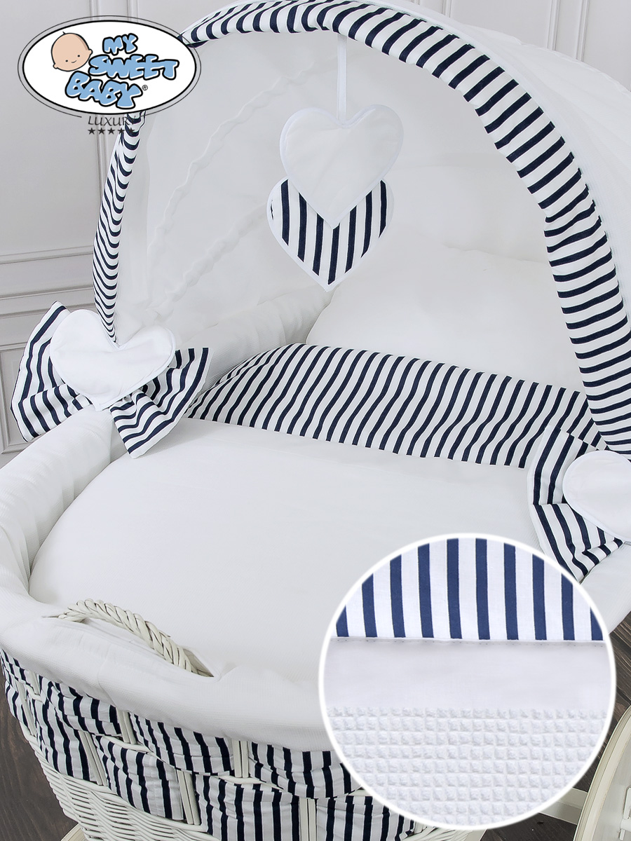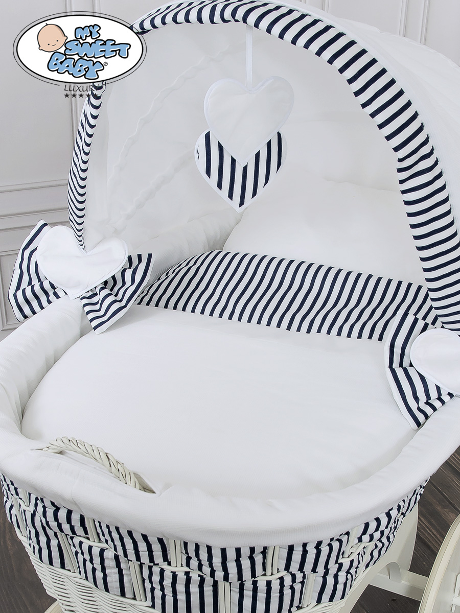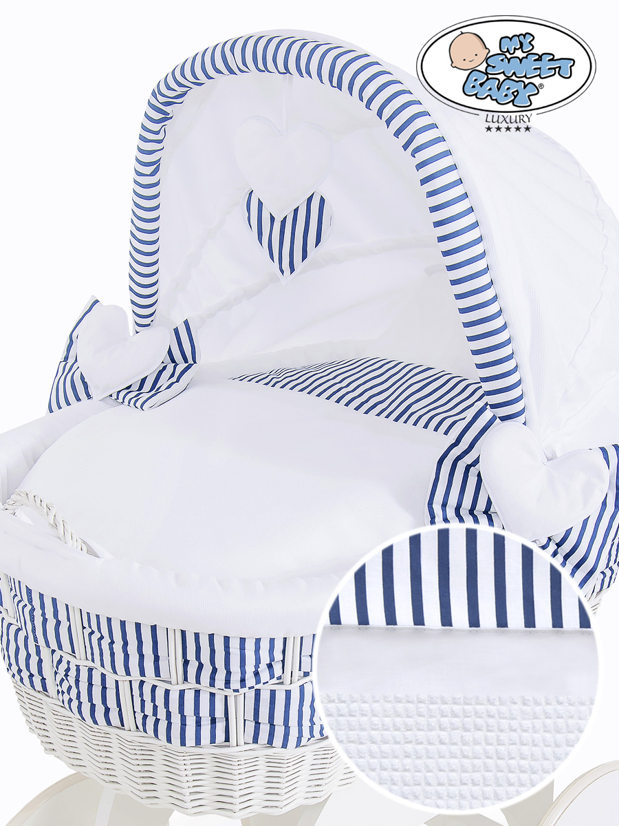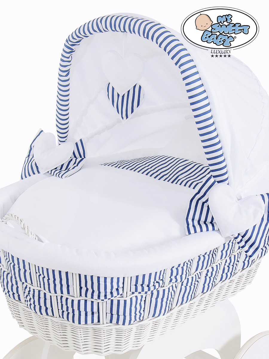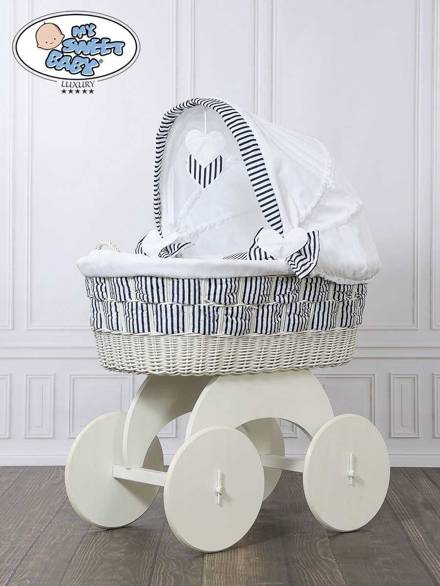 Hjemmeside » Kurvevugge » Babyvugge My Sweet Baby Luxury » Babyvugge med Kaleche » Babyvugge med Kaleche » Babykurv med hjul naturlig vidje og træ kaleche Hannah Blåt-Hvidt Zigzag Sengesæt Marina