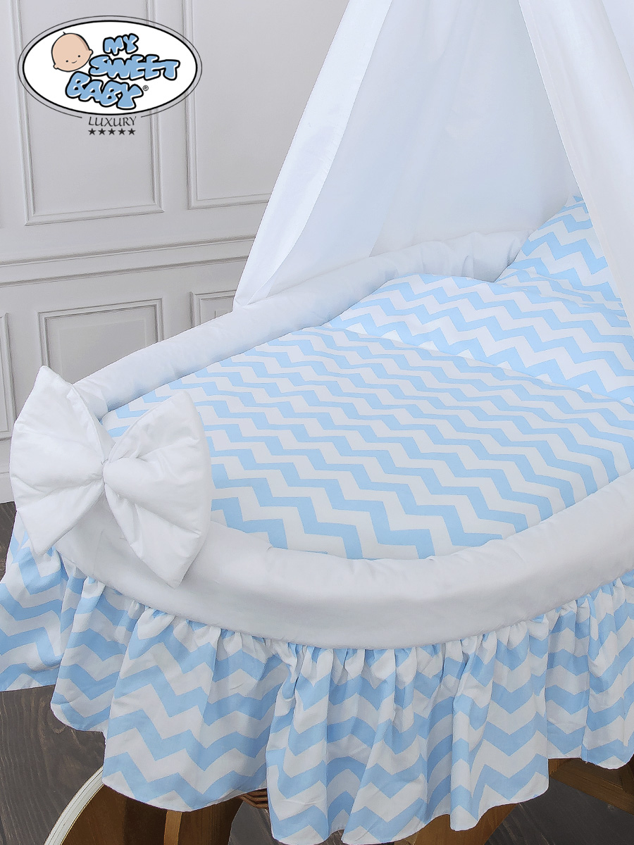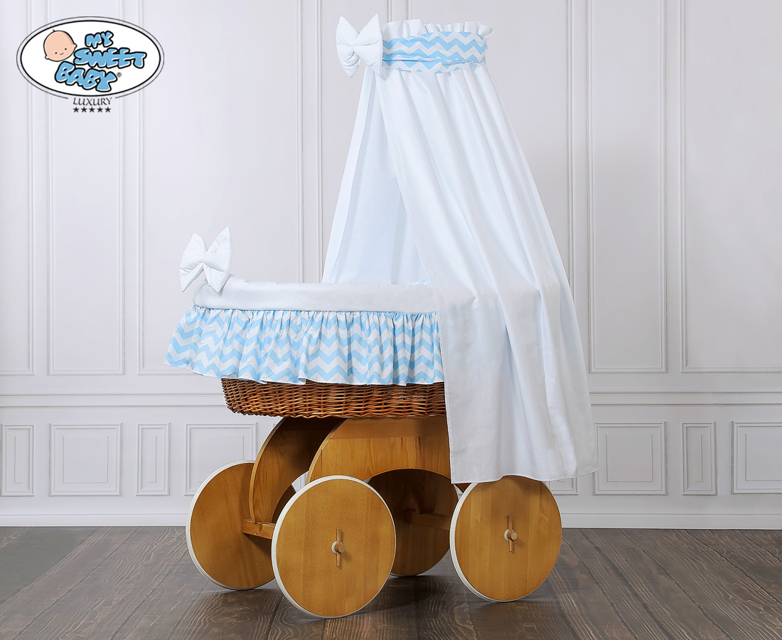 Hjemmeside » Kurvevugge » Babyvugge My Sweet Baby Luxury » Babyvugge med sengehimmel » Babyvugge med sengehimmel » Babykurv på hjul Blå Siksak Hannah