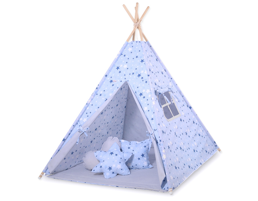 Hjemmeside » Legetøj & Hyggeligt Legetøj » Tipi telte » Børne Tipi Telt » Børne tipi telt dekorative fjer GRATIS! Blå Grå Stjerner