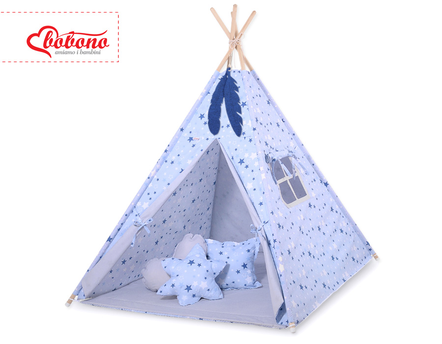 Børne tipi telt dekorative fjer GRATIS! Blå Grå Stjerner