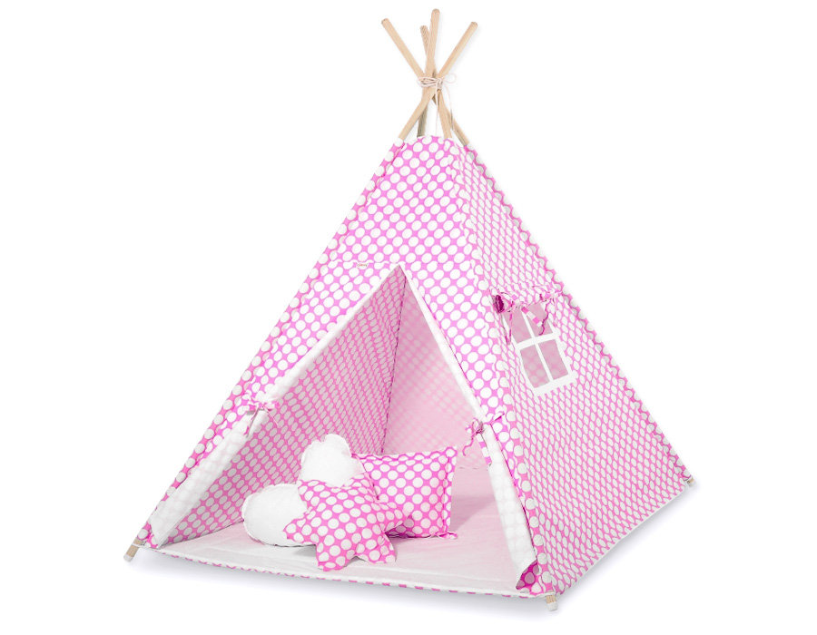 Hjemmeside » Legetøj & Hyggeligt Legetøj » Tipi telte » Børne Tipi Telt » Børne tipi telt dekorative fjer GRATIS! Lyserød Pink Polkaprikker
