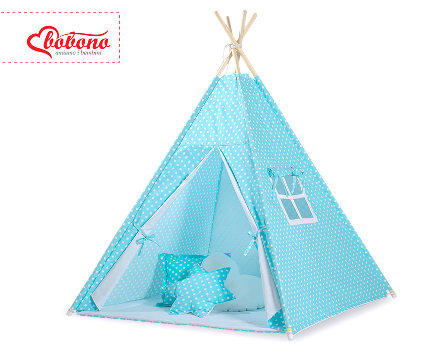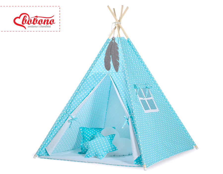 Hjemmeside » Legetøj & Hyggeligt Legetøj » Tipi telte » Børne Tipi Telt » Børne tipi telt dekorative fjer GRATIS! Turkis Polkaprikker