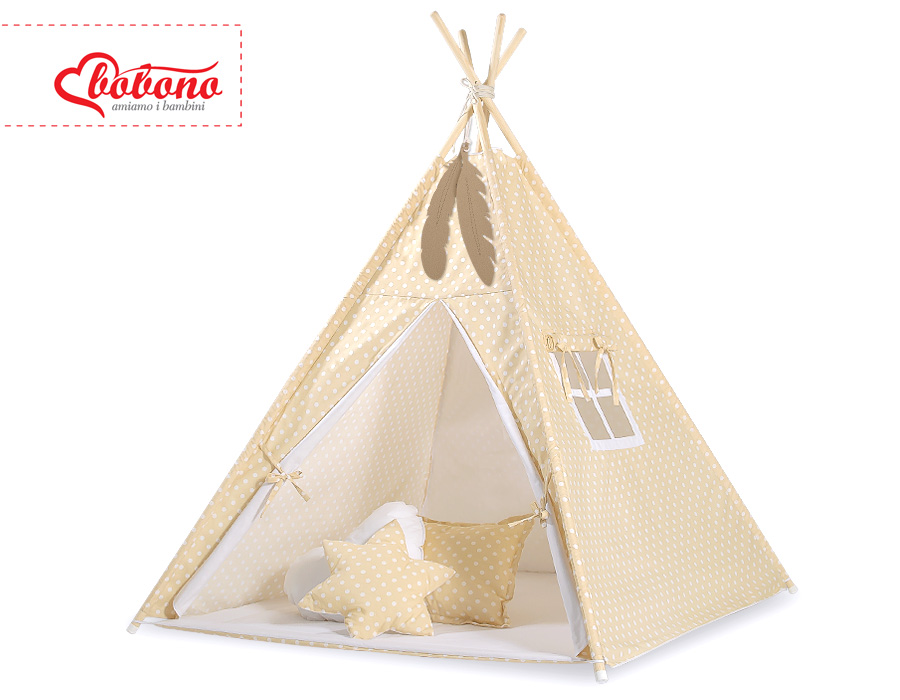 Hjemmeside » Legetøj & Hyggeligt Legetøj » Tipi telte » Mini sæt Tipi Telt Børn med legetæppe » Børne tipi telt legetæppe dekorative fjer GRATIS! Beige Polkaprikker