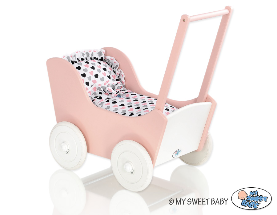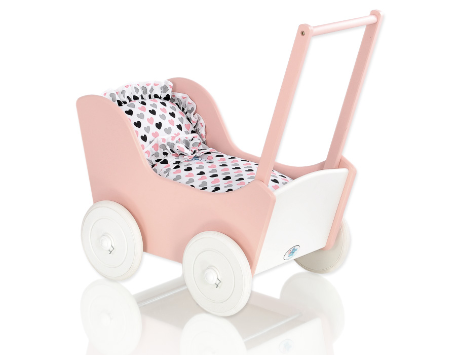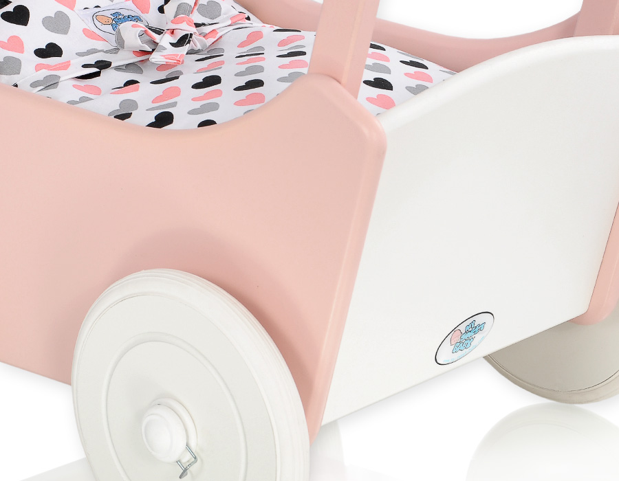 Dukkevogn i træ  Hvid Pulverrosa