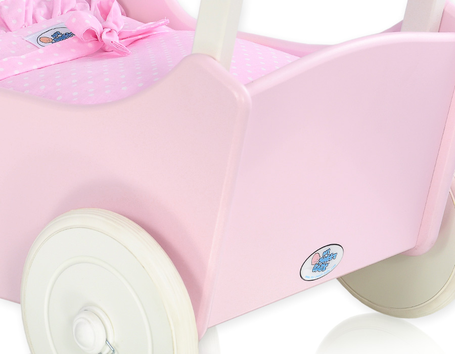 Hjulene har glidefaste dæk der ikke ridser gulvet. Dukkevognen har et justerbart træhåndtag. Det kan indstilles i to højder (53cm eller 55cm måles fra gulvet).