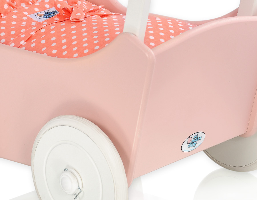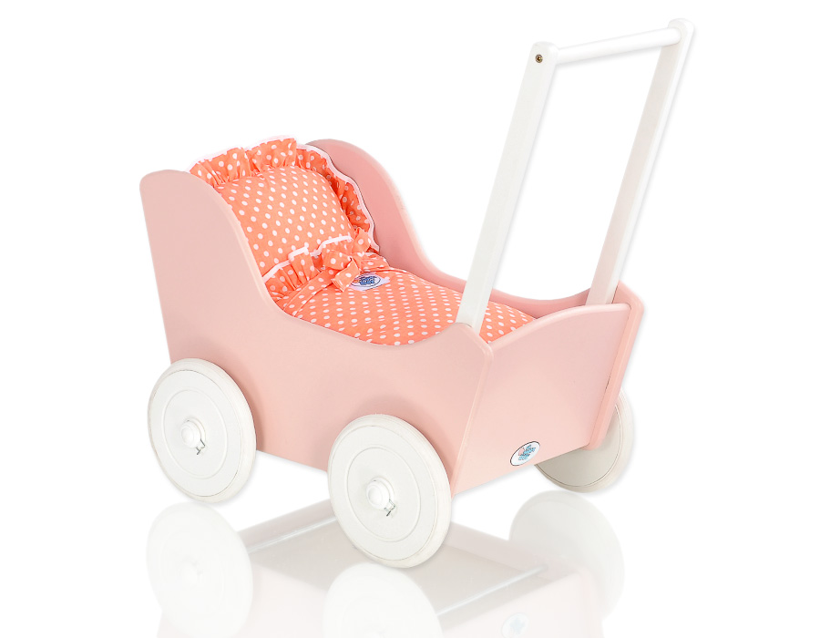 Flot gave til en lille pige. Dukkevogne er top produktet for børn. Lavet af sikre materialer. Malet med økologisk maling. Hjulene er sat på metalakser, med en klik-klak mekanisme der gør de nemt drejer, og ikke falder.