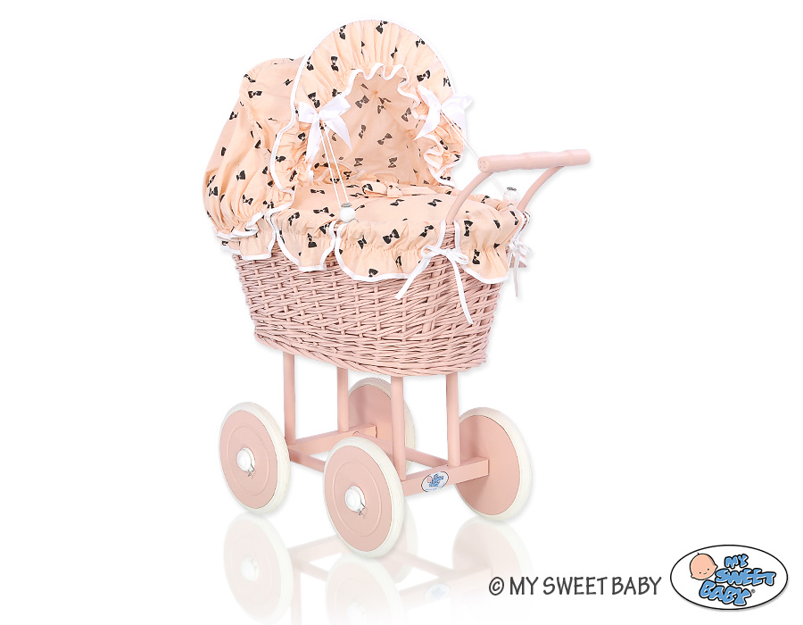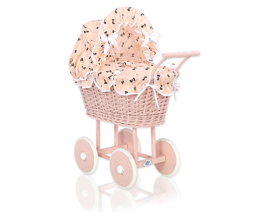 Flettet dukkevogn med sengesæt  Sløjfer Pulverrosa