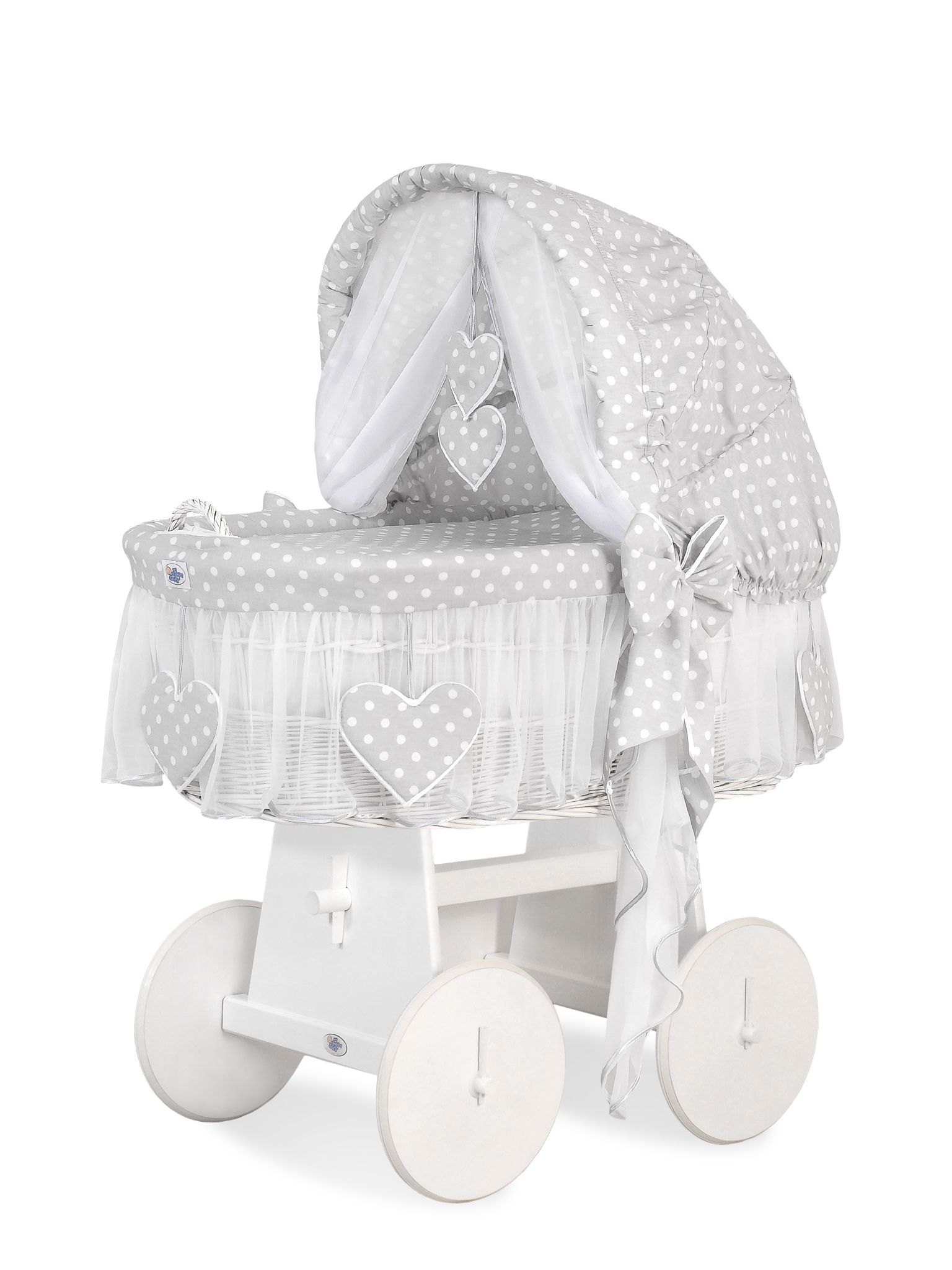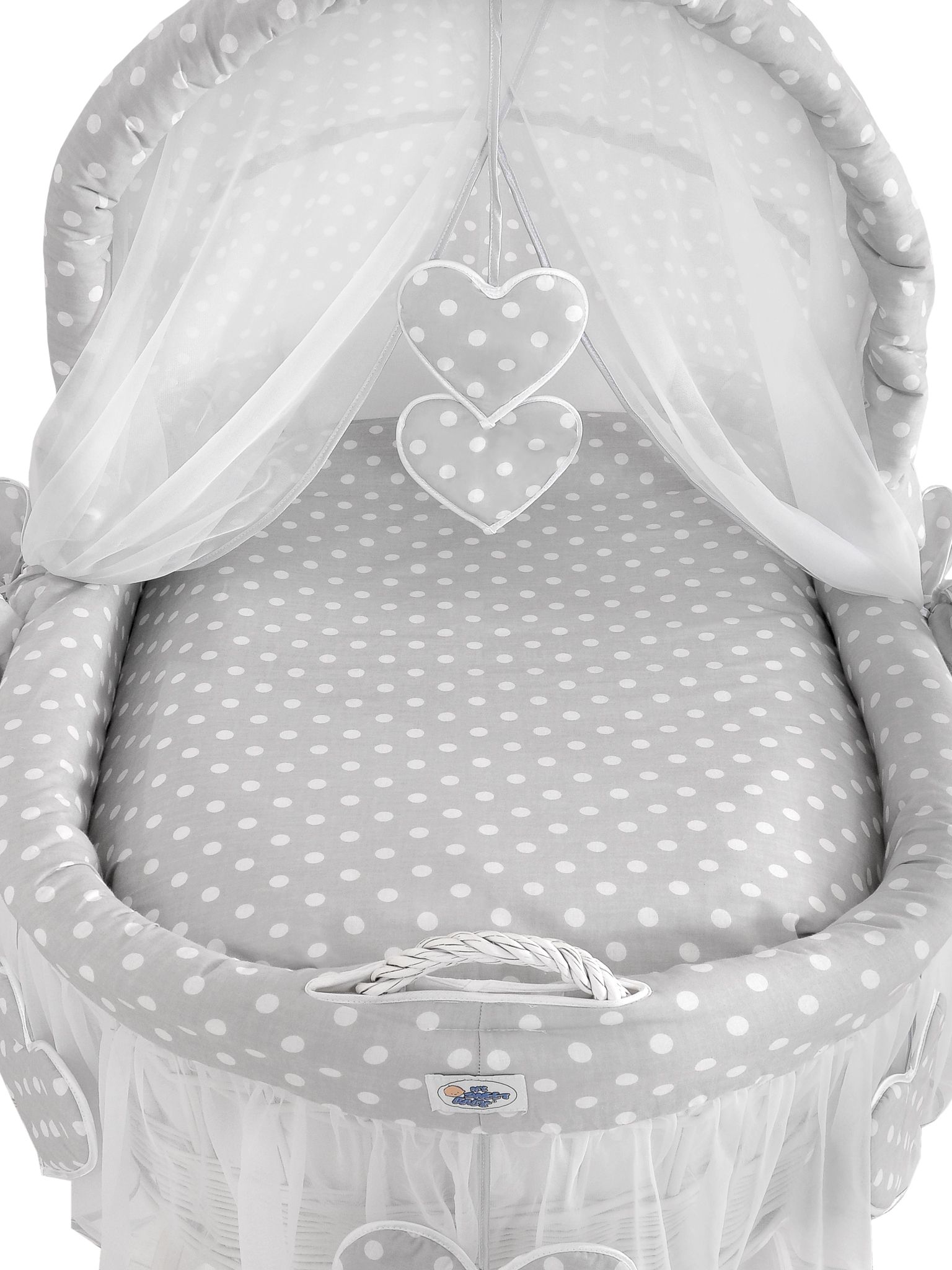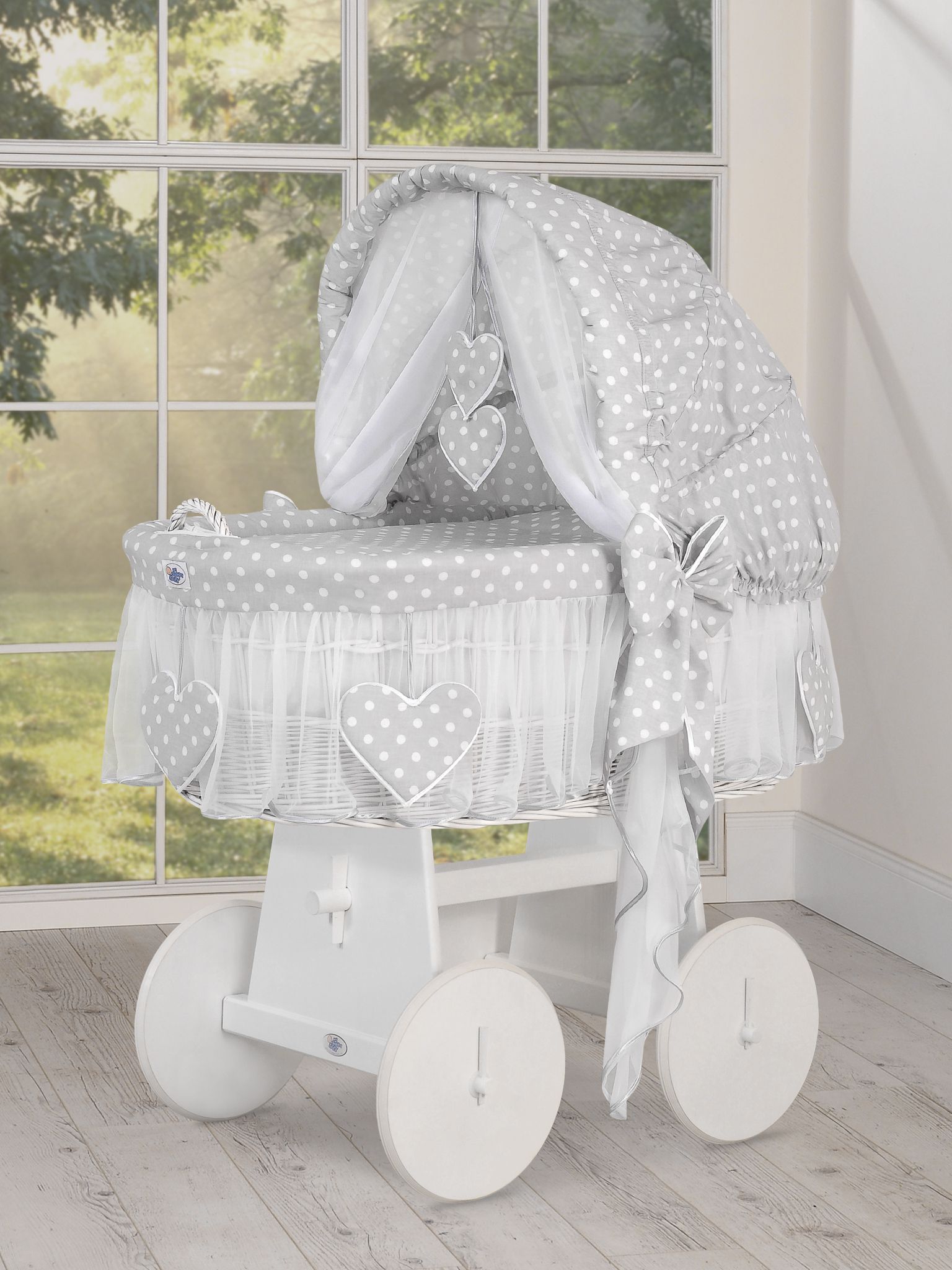 Hjemmeside » Kurvevugge » Flettet vugge med kaleche på hjul » Flettet vugge med kaleche på hjul » Flettet moseskurv til baby Hvid Grå Polkaprikker Amelie