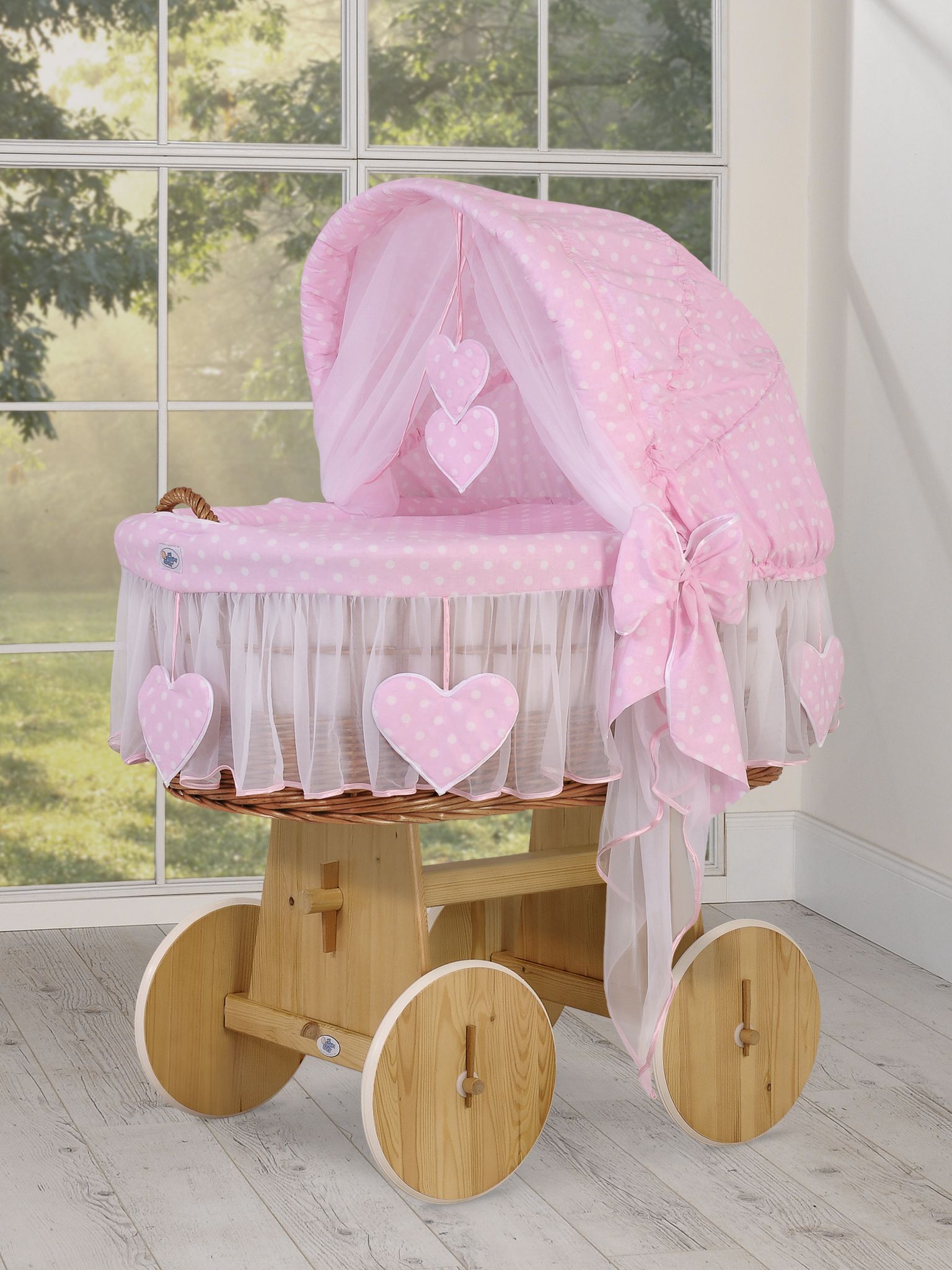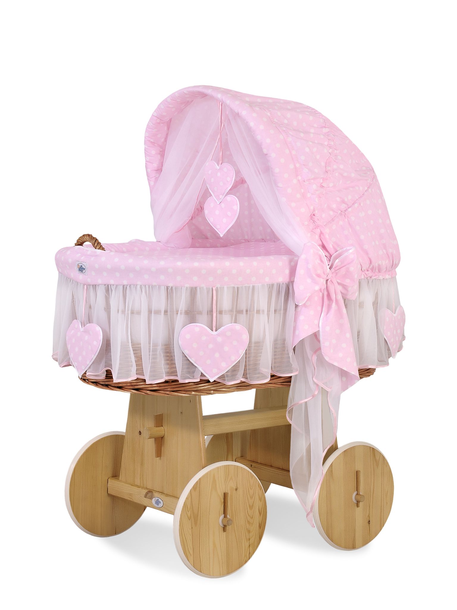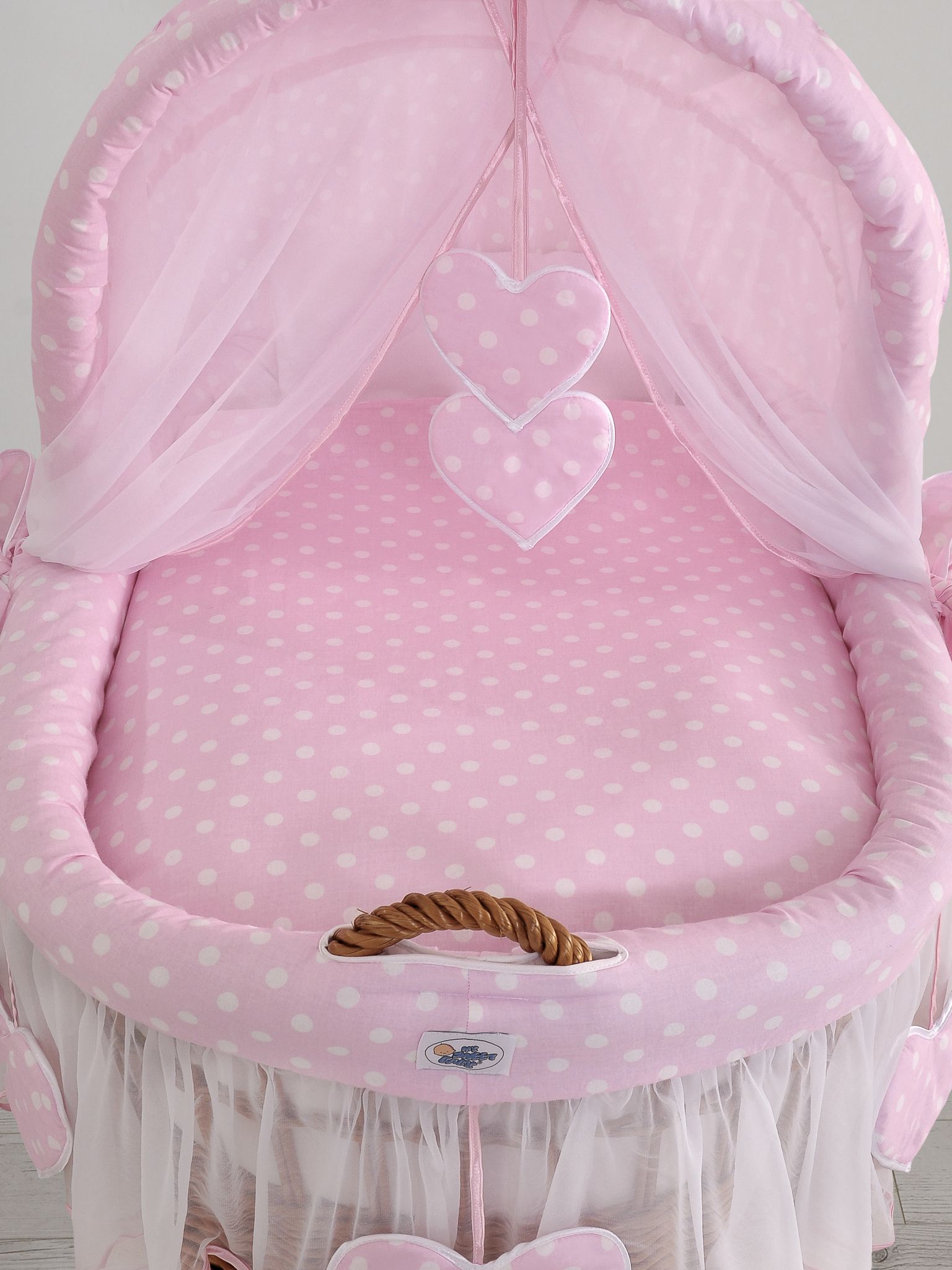 Hjemmeside » Kurvevugge » Flettet vugge med kaleche på hjul » Flettet vugge med kaleche på hjul » Flettet moseskurv til baby Lyserød Pink Polkaprikker Amelie