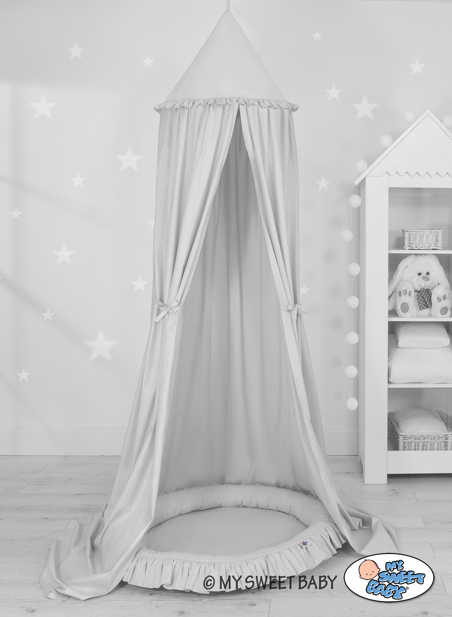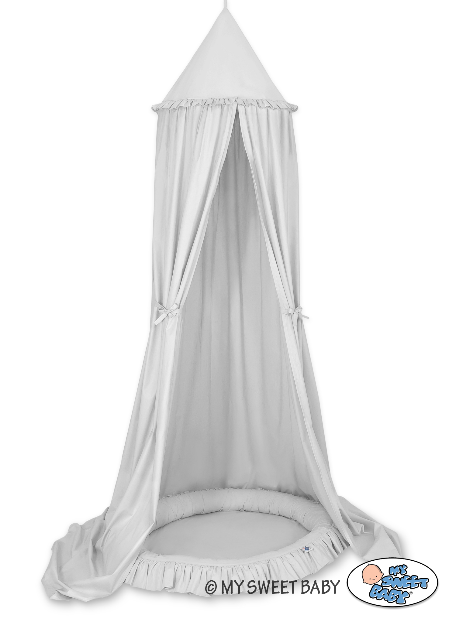 En effektiv, lang hængende sengehimmel. Et smukt element i børneværelset. Den kan bruges som en unik dekoration til en babyseng, såvel som den kan være et fantastisk sted at lege. Hængende over babysengen, beskytter den mod for meget lyd og lys, og giver et hyggeligt og trygt sted at hvile sig i babysengen. Sengehimmelen kan nemt monteres til loftet. Længden på 260cm gør det muligt at arrangere enderne på gulvet. Dette skaber et perfekt gemmested og en legeplads for ældre børn. Sengehimmelen er lavet af Okotex godkendt, 100% bomuldsstof. På siderne er der praktiske sløjfer til at knytte gardinerne og skabe et smukt telt. Kanten på toppen kan tages af. Stoffer kan vaskes i maskine på 30 grader.