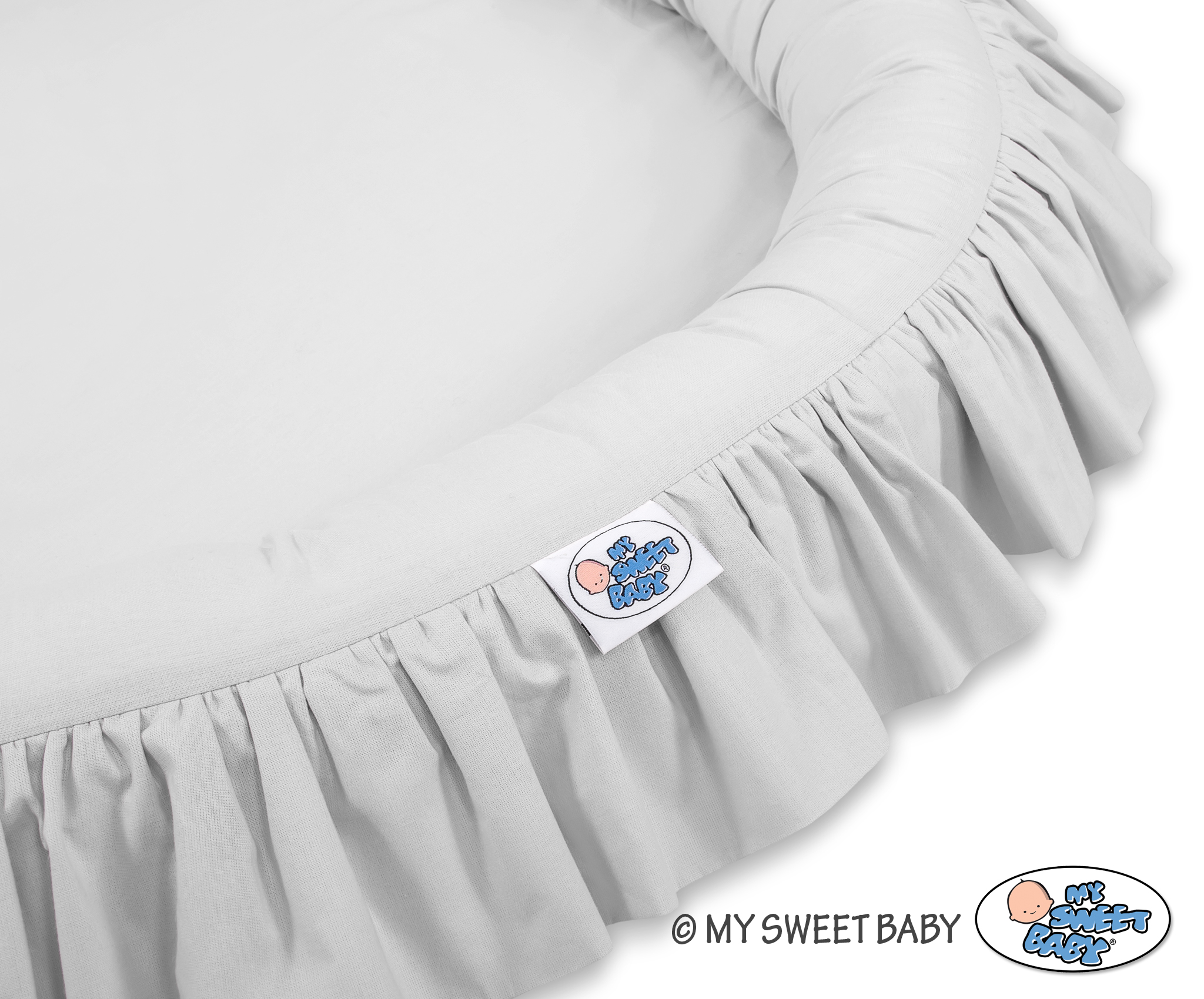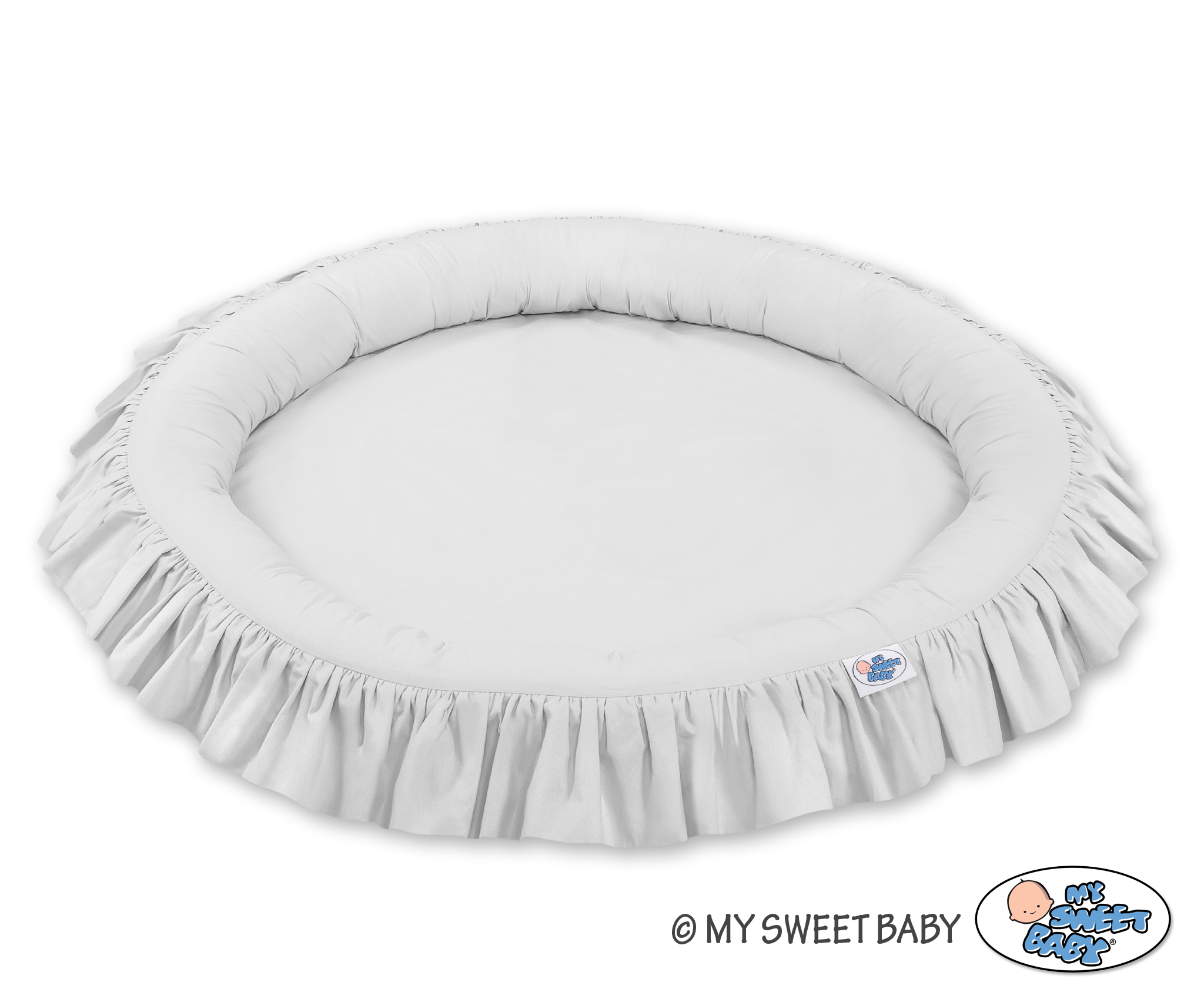Smuk rede med en flæset kant. En funktionel og praktisk rede for leg. Reden er ideel som et sted at lege, eller som en babyrede til at have på gulvet for den lange sengehimmel. Reden med flæsekant kan bruges fra de første dage i livet som et trygt sted at hvile.