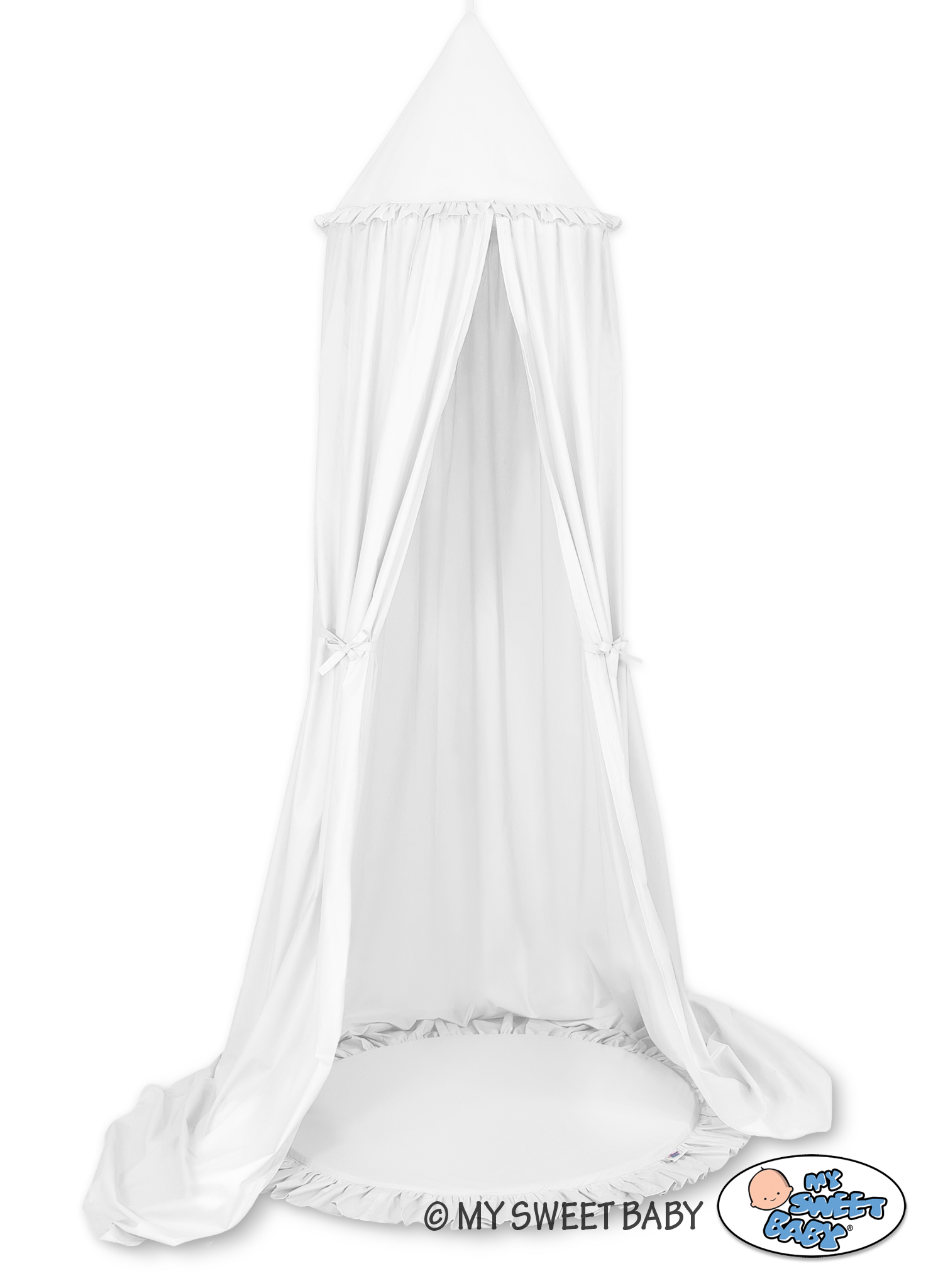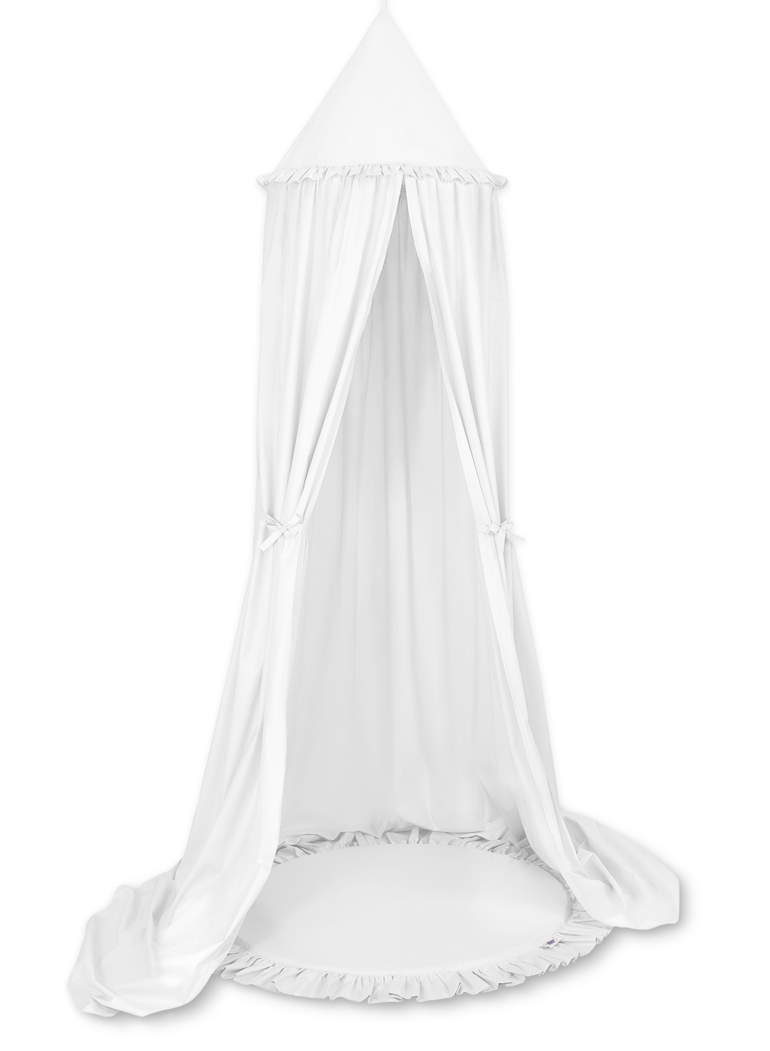 En effektiv, lang hængende sengehimmel. Et smukt element i børneværelset. Den kan bruges som en unik dekoration til en babyseng, såvel som den kan være et fantastisk sted at lege. Hængende over babysengen, beskytter den mod for meget lyd og lys, og giver et hyggeligt og trygt sted at hvile sig i babysengen. Sengehimmelen kan nemt monteres til loftet. Længden på 260cm gør det muligt at arrangere enderne på gulvet. Dette skaber et perfekt gemmested og en legeplads for ældre børn. Sengehimmelen er lavet af Okotex godkendt, 100% bomuldsstof. På siderne er der praktiske sløjfer til at knytte gardinerne og skabe et smukt telt. Kanten på toppen kan tages af. Stoffer kan vaskes i maskine på 30 grader.
