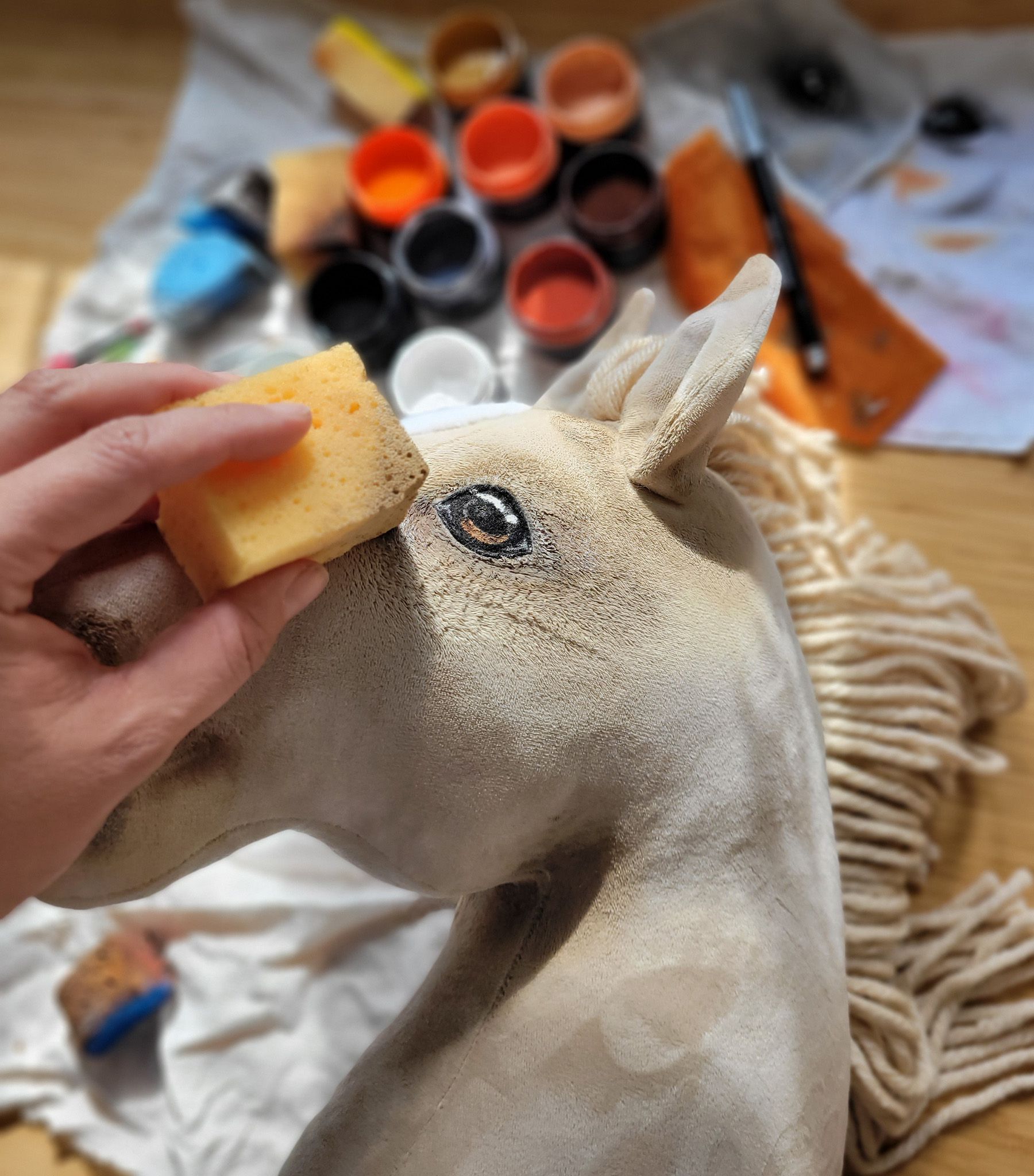 Super Kæphest er håndmalet og skygget, omhyggeligt og præcist, for at få den til at se ud som en rigtig hest. Vi bruger kun godkendte stofmaling, miljøvenlige.