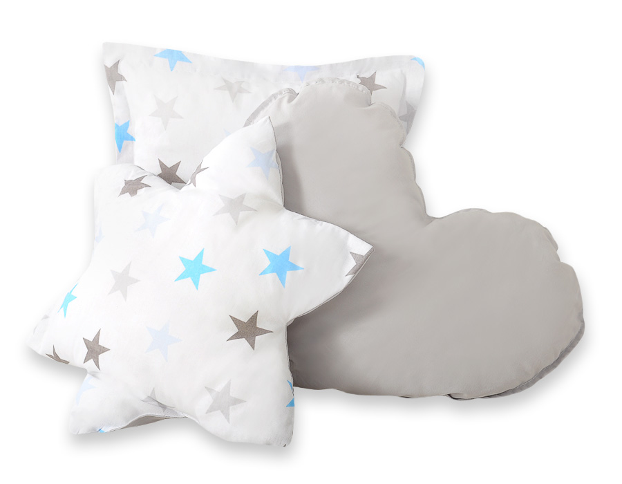 Bløde, fluffy puder, der matcher teltfarven. Hver pude i forskellig original, dekorativ form. Puder er tofarvede - hver side lavet af forskelligt materiale. Også perfekt som en farverig dekoration til børneværelset.