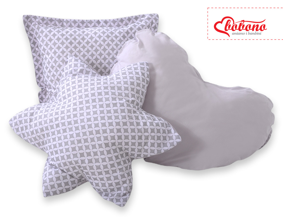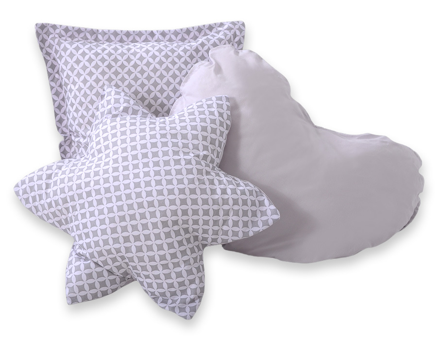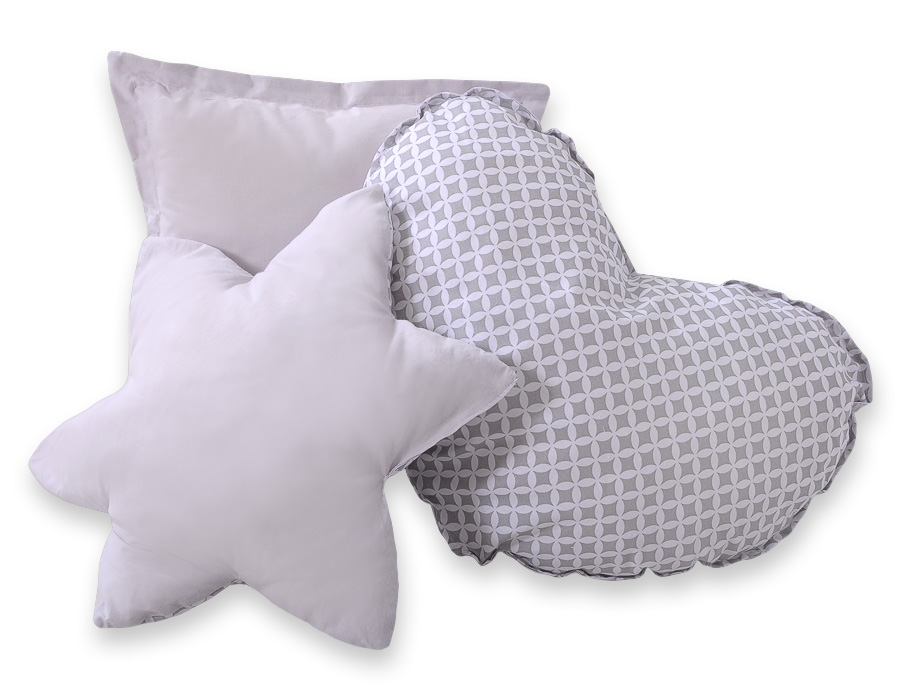 Bløde, fluffy puder, der matcher teltfarven. Hver pude i forskellig original, dekorativ form. Puder er tofarvede - hver side lavet af forskelligt materiale. Også perfekt som en farverig dekoration til børneværelset.