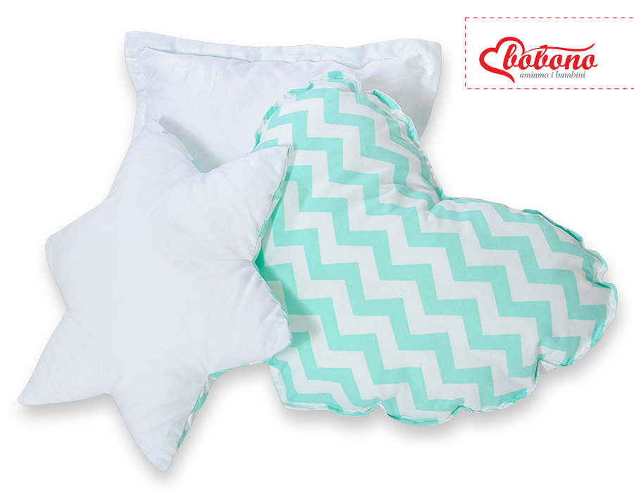 Bløde, fluffy puder, der matcher teltfarven. Hver pude i forskellig original, dekorativ form. Puder er tofarvede - hver side lavet af forskelligt materiale. Også perfekt som en farverig dekoration til børneværelset.