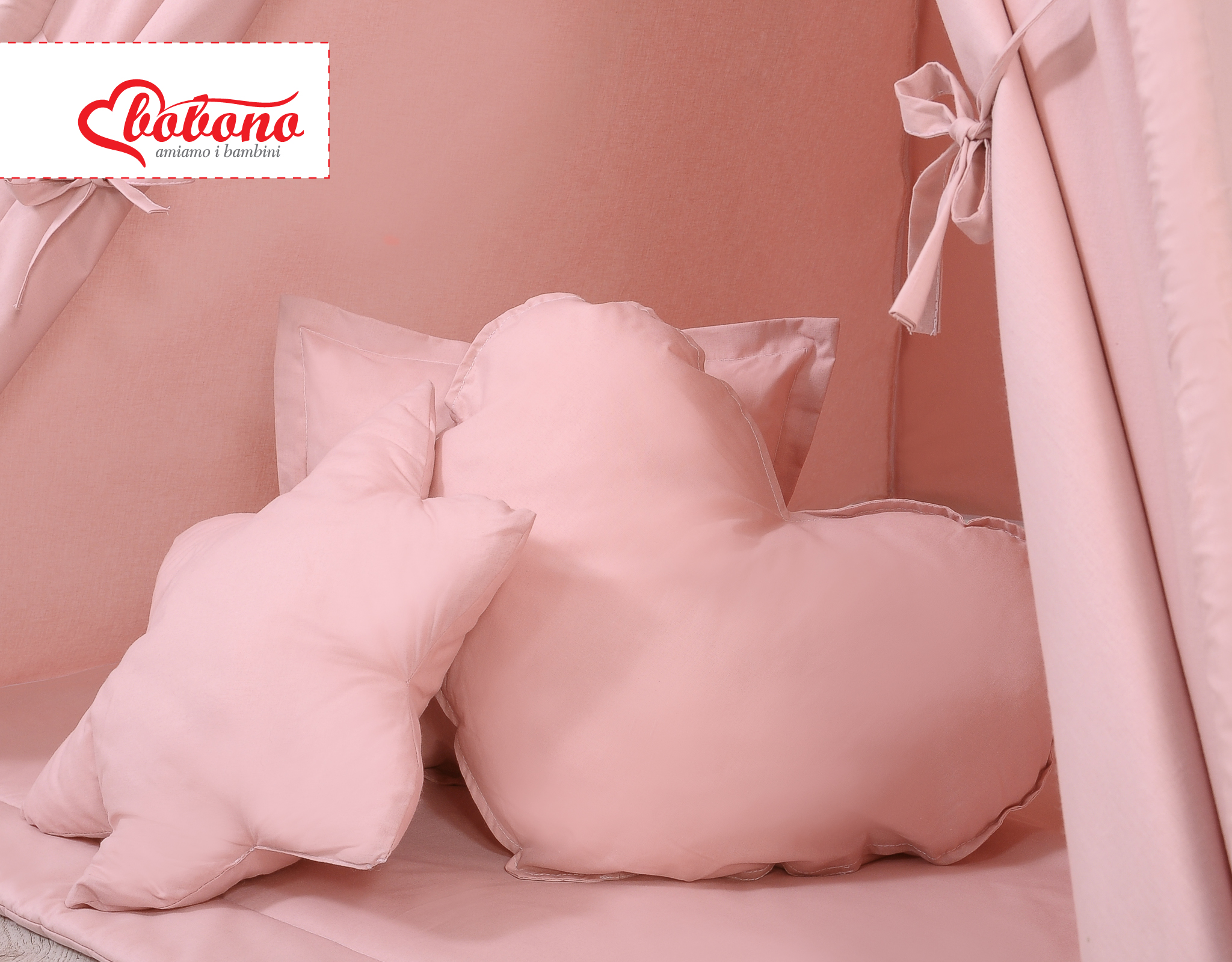 Bløde, fluffy puder, der matcher teltfarven. Hver pude i forskellig original, dekorativ form. Puder er tofarvede - hver side lavet af forskelligt materiale. Også perfekt som en farverig dekoration til børneværelset.