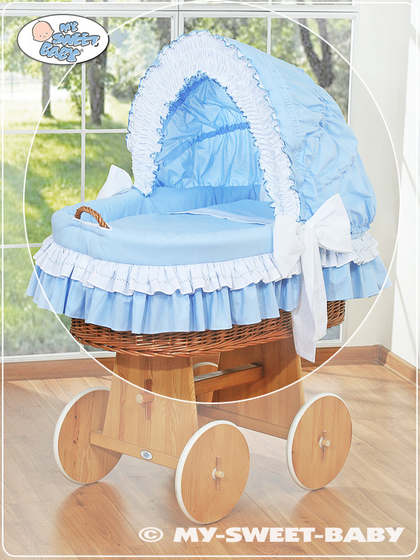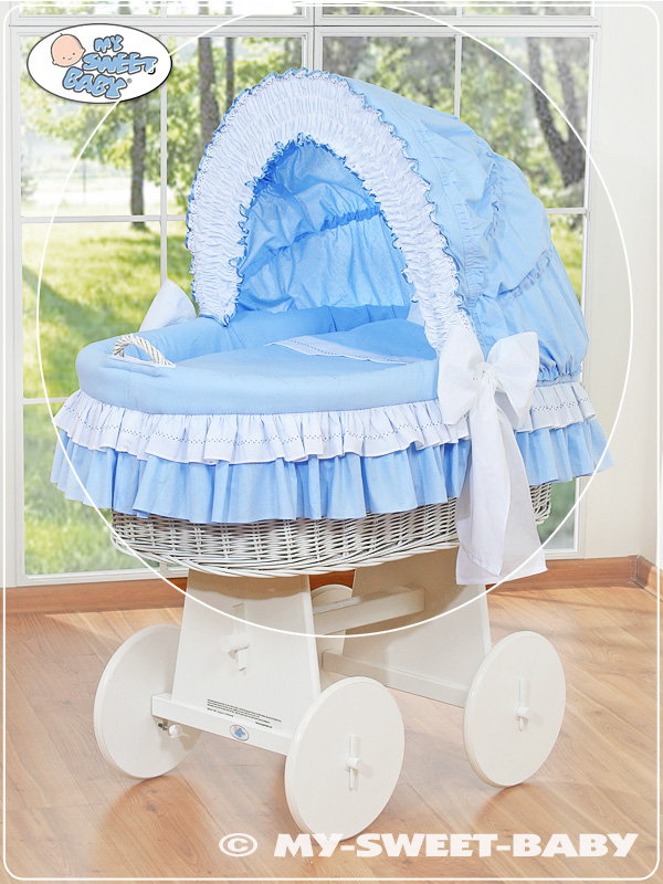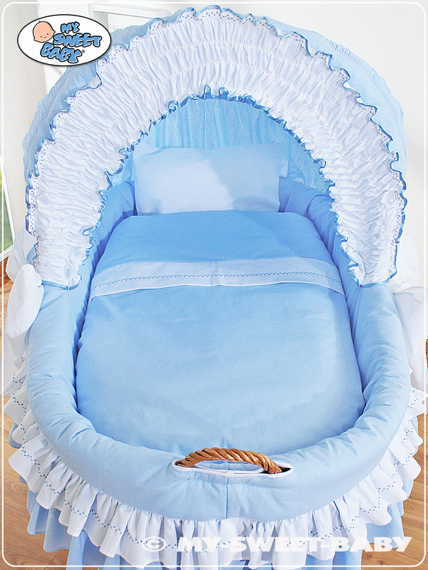 Hjemmeside » Kurvevugge » Flettet vugge med kaleche på hjul » Ekstra vuggesæt 4-delt » Nyt ekstra sengesæt af betræk for flettet babykurv Blå