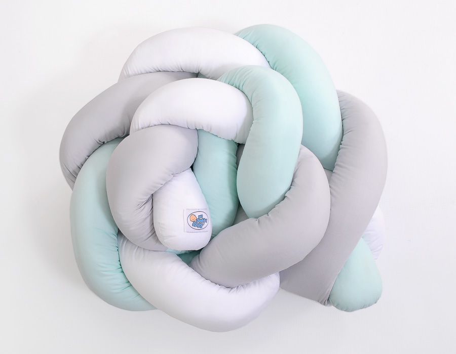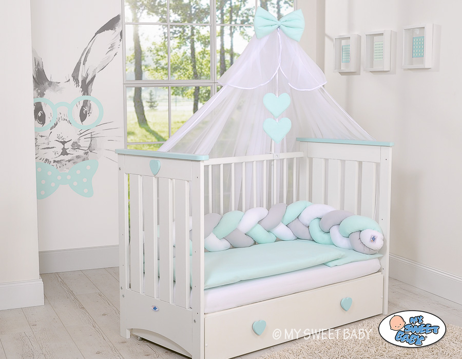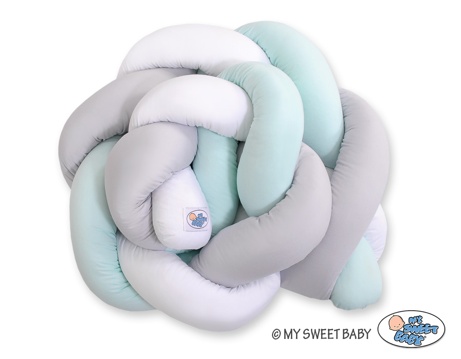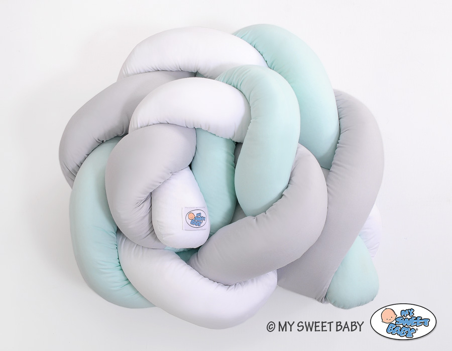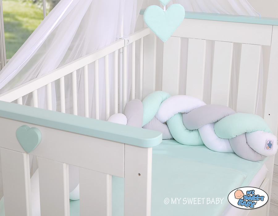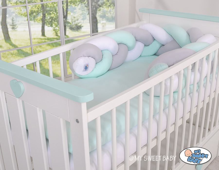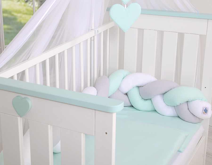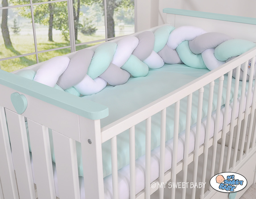 Hjemmeside » Flettet Kollektion » Flettet sengerand XXL » Sengerand flettet til babyseng Snoet Mint Hvid Grå