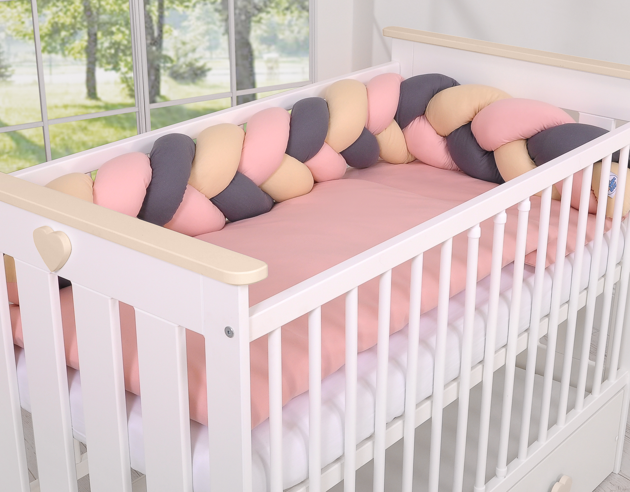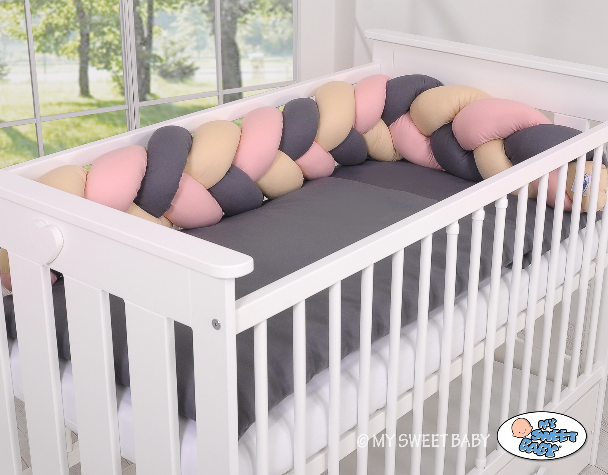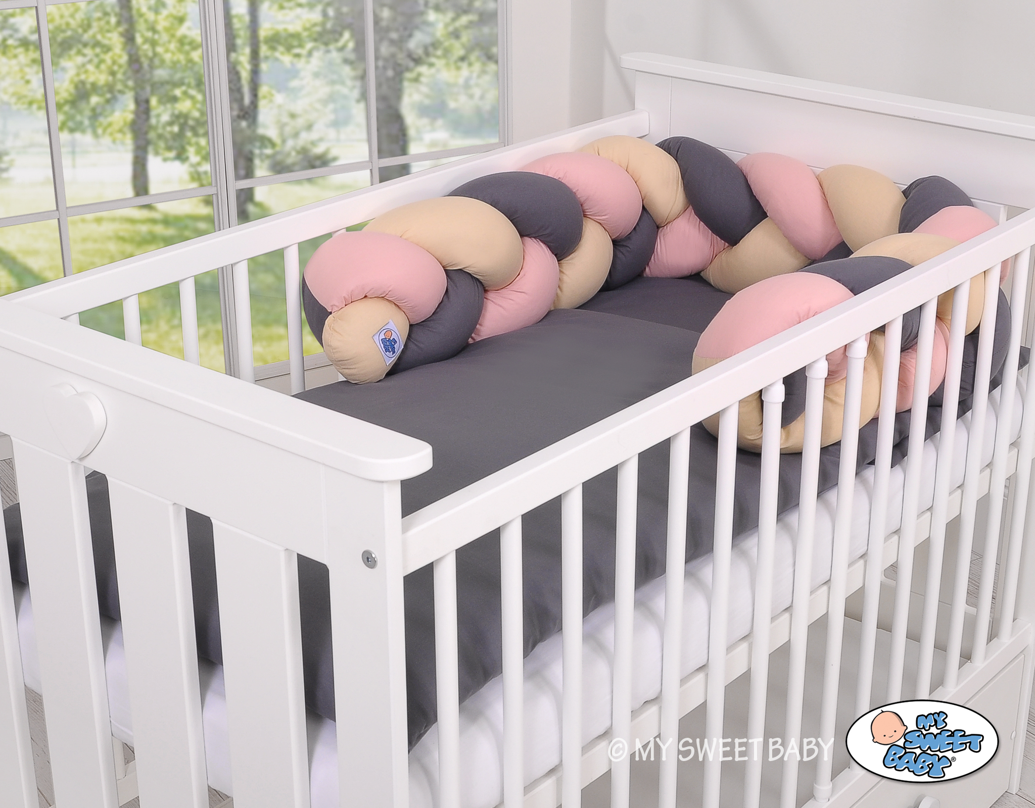 Hjemmeside » Flettet Kollektion » Flettet sengerand XXL » Sengerand flettet til tremmeseng 180cm Beige Antracit Støvet Pink