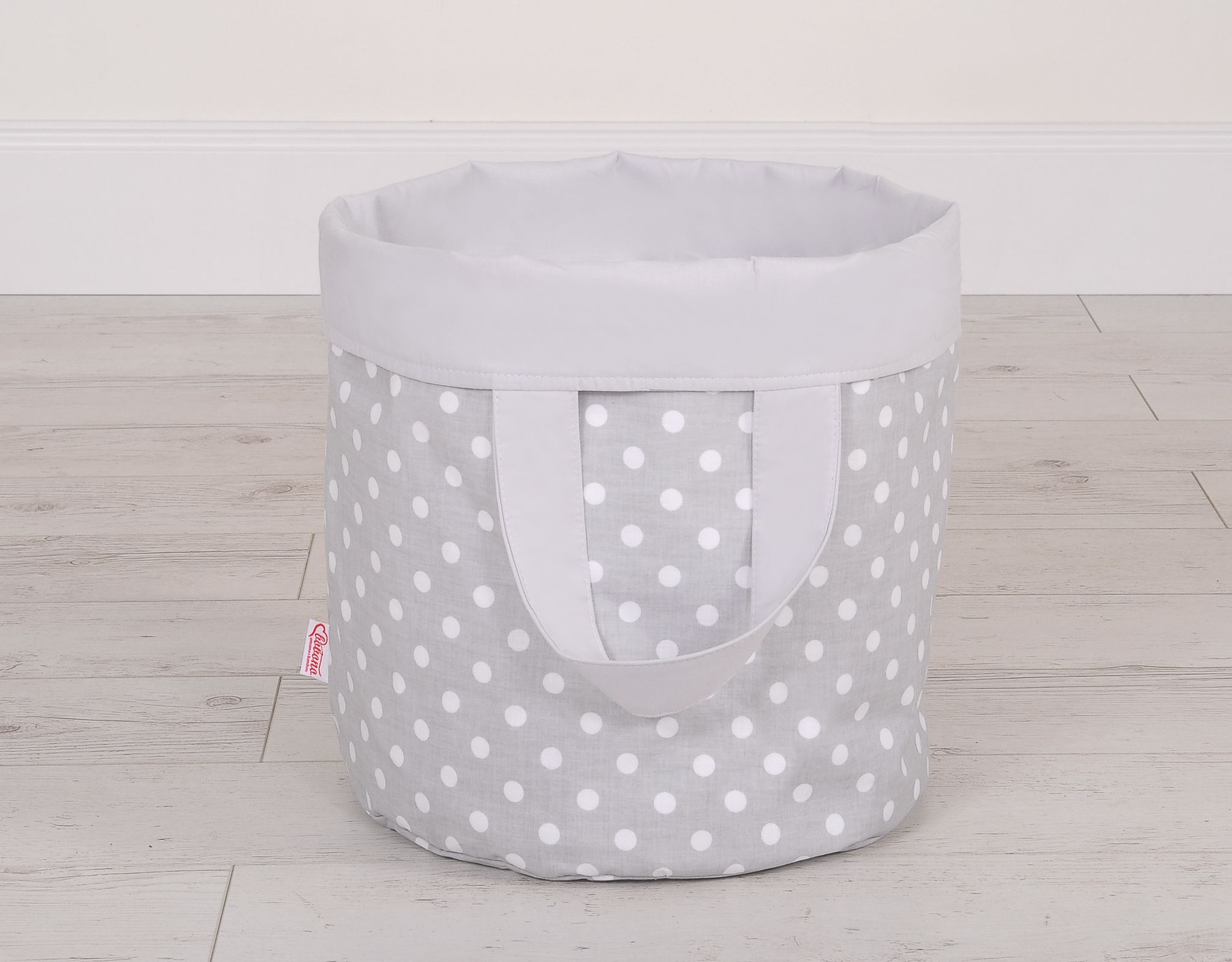 Hjemmeside » Legetøj & Hyggeligt Legetøj » Dobbeltsidet legetøjskurv » Dobbeltsidet legetøjskurv S » Stofkurv til legetøj S Grå Polkaprikker