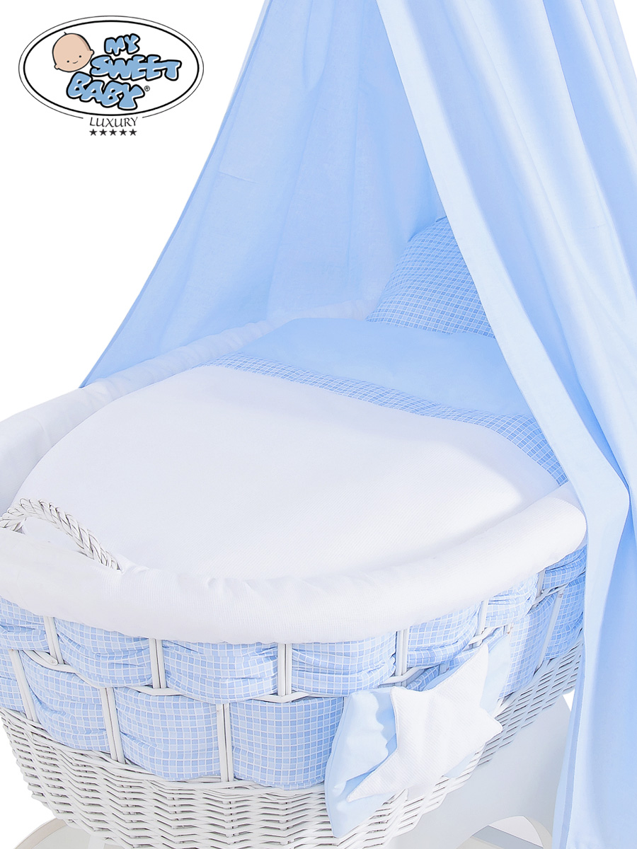 Hjemmeside » Kurvevugge » Babyvugge My Sweet Baby Luxury » Babyvugge med sengehimmel » Tekstil Udstyr til Vugge Voile 4 dele » Stofsæt 4 dele for Moseskurv / flettet babykurv Blå-hvid Zigzag Sengetøjssæt Isabella