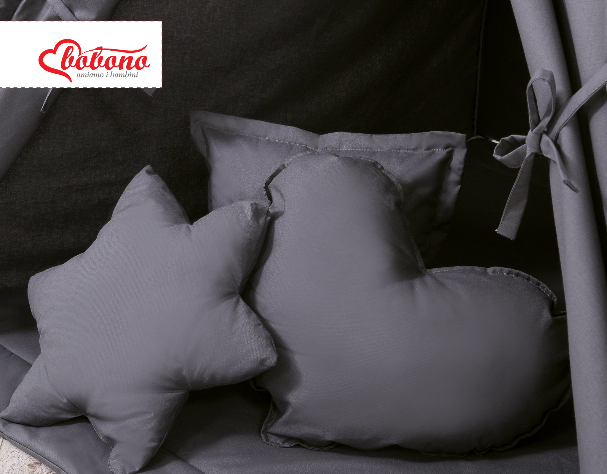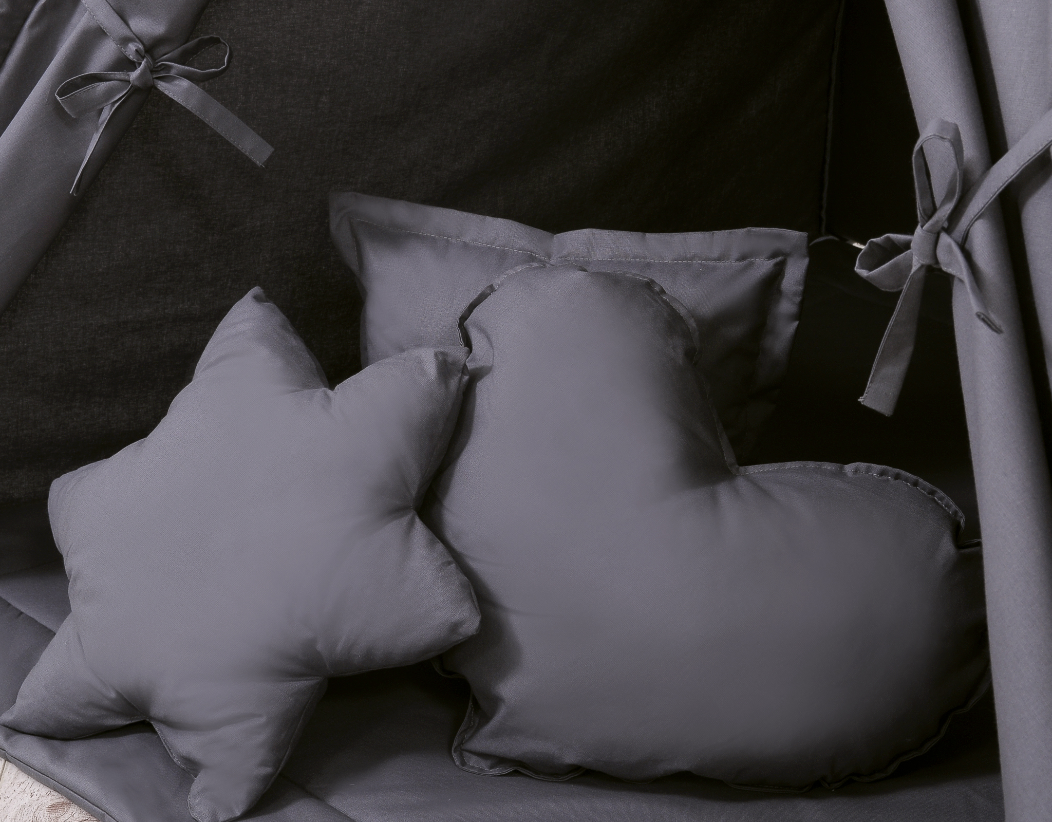 Bløde, fluffy puder, der matcher teltfarven. Hver pude i forskellig original, dekorativ form. Puder er tofarvede - hver side lavet af forskelligt materiale. Også perfekt som en farverig dekoration til børneværelset.