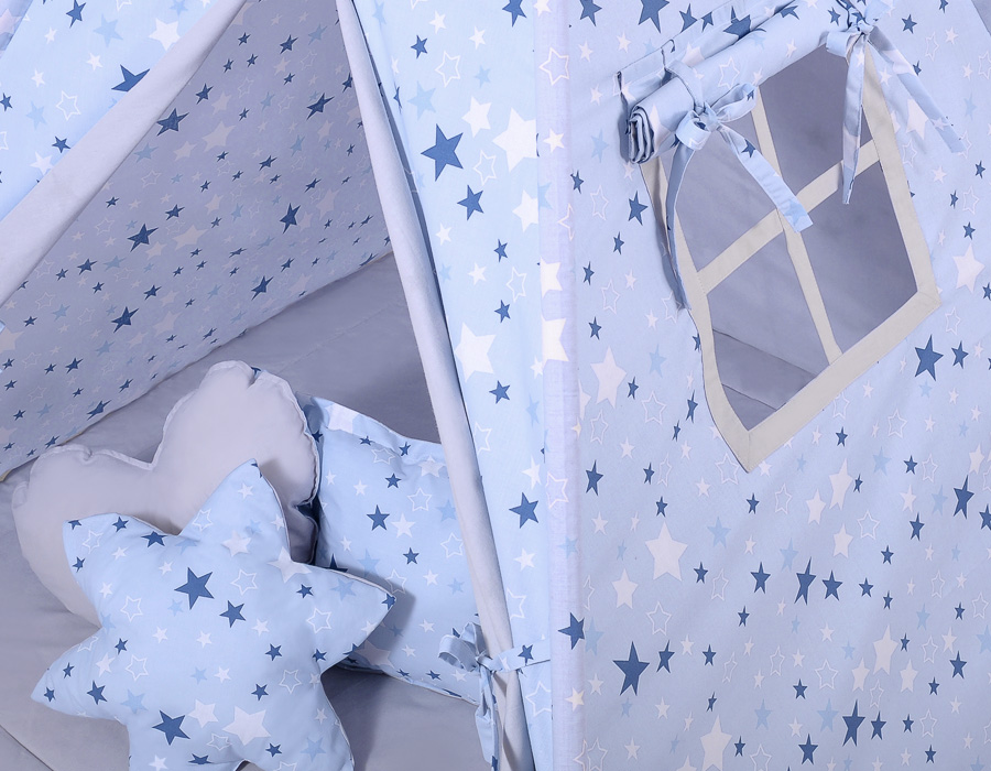 Hjemmeside » Legetøj & Hyggeligt Legetøj » Tipi telte » Mega Sæt: Tipi Telt med Legetæppe og Puder » Teltsæt Tipi Telt Børn med legetæppe + puder sæt Blå Stjerner