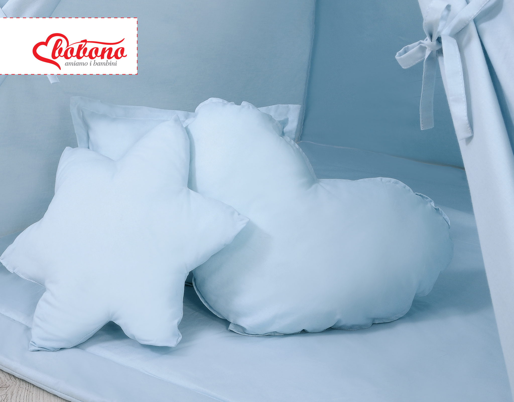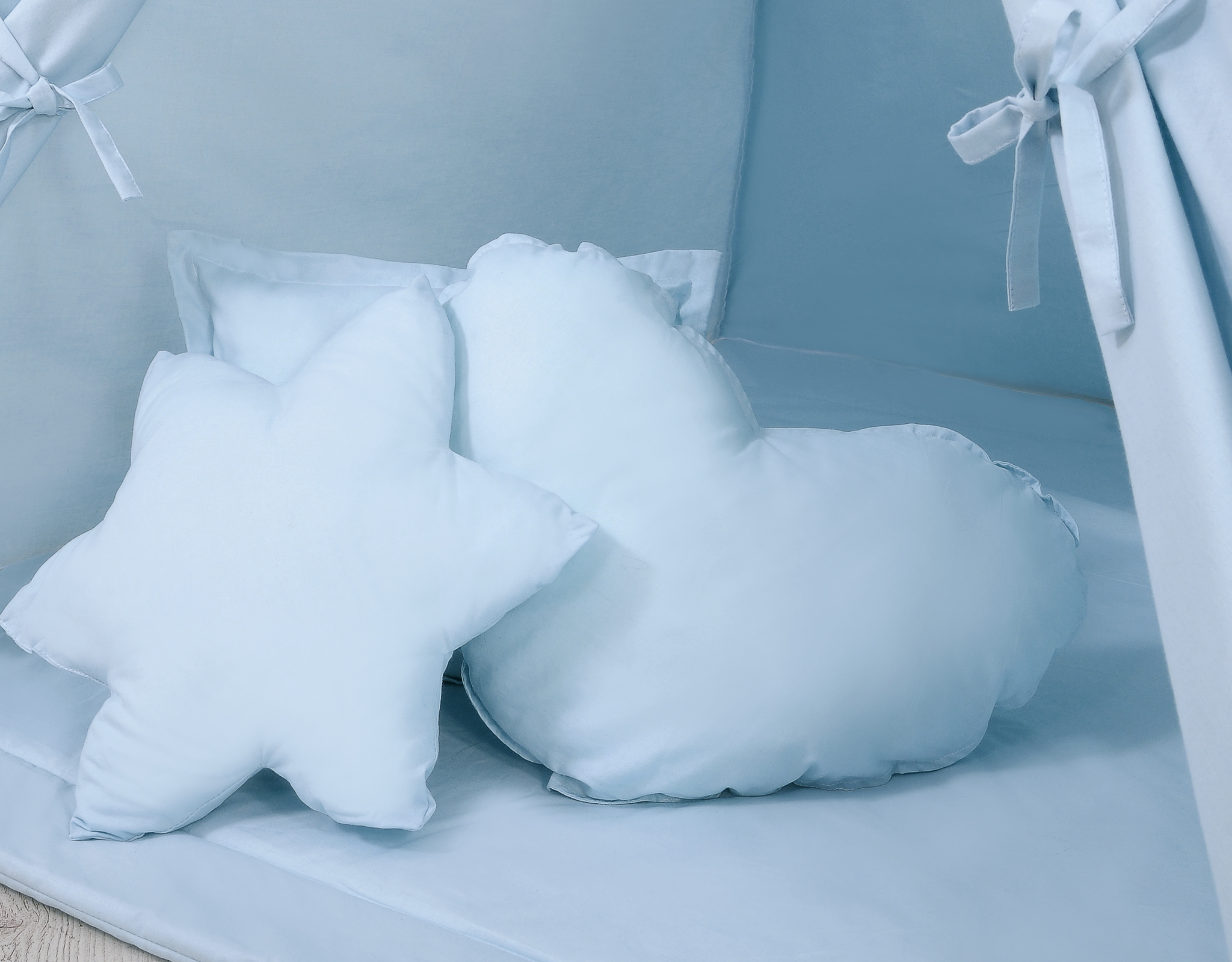 Bløde, fluffy puder, der matcher teltfarven. Hver pude i forskellig original, dekorativ form. Puder er tofarvede - hver side lavet af forskelligt materiale. Også perfekt som en farverig dekoration til børneværelset.