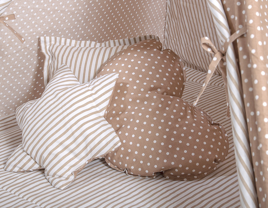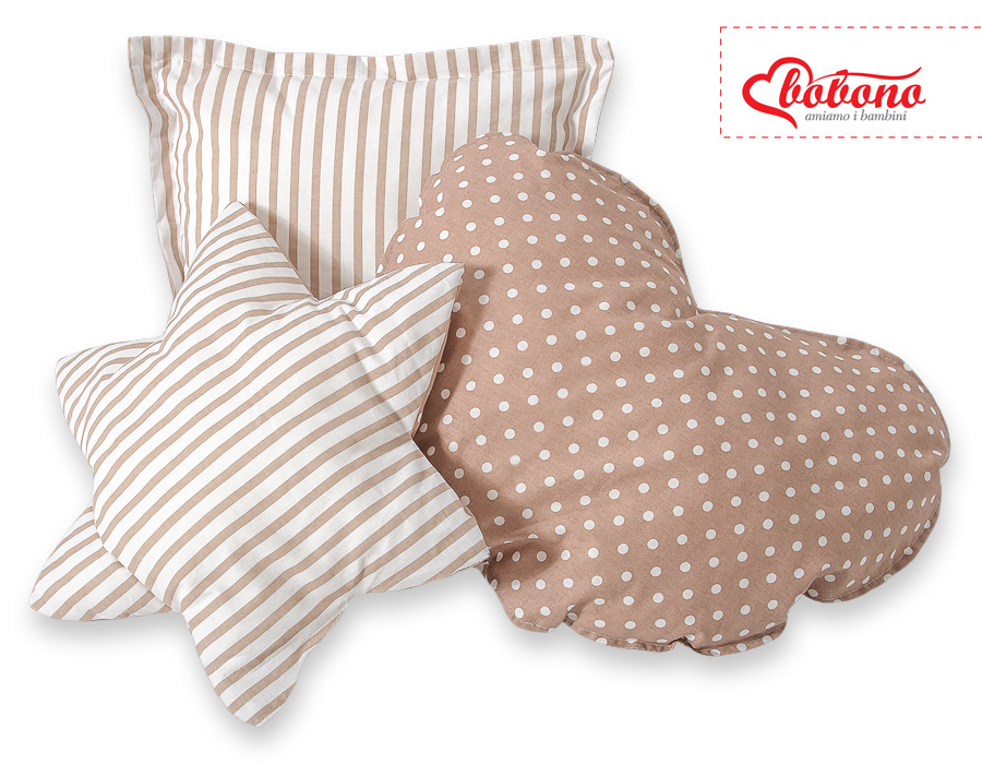 Bløde, fluffy puder, der matcher teltfarven. Hver pude i forskellig original, dekorativ form. Puder er tofarvede - hver side lavet af forskelligt materiale. Også perfekt som en farverig dekoration til børneværelset.