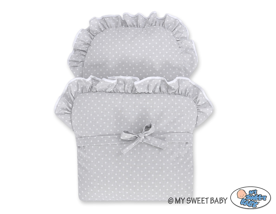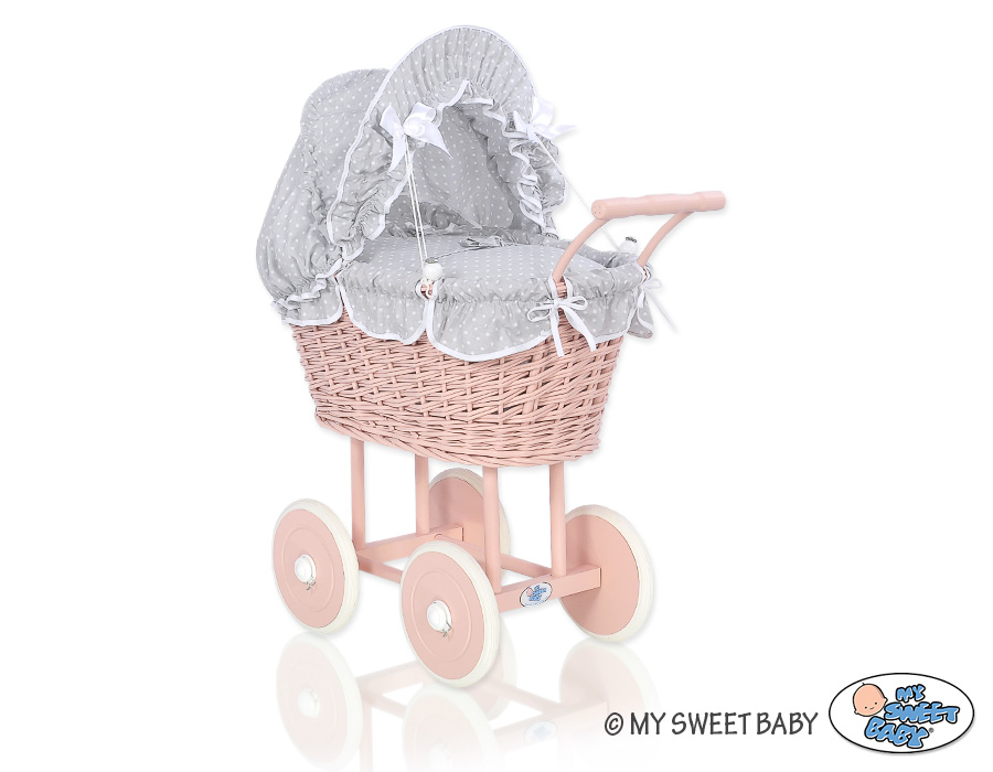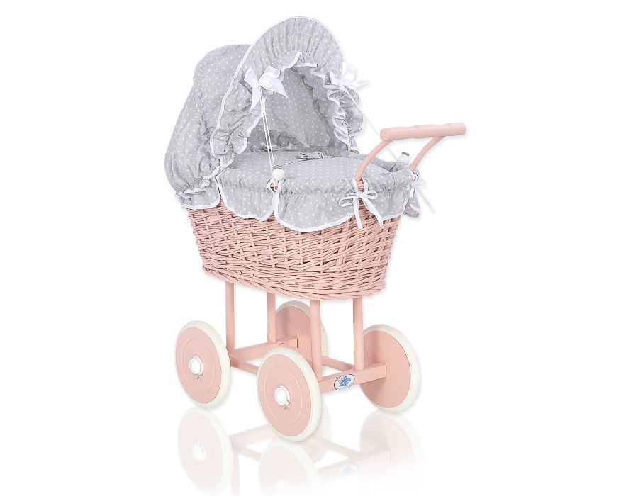 Vogn i pileflet til dukke  Hvid Grå Polkaprikker PulverrosaVogn i pileflet til dukke  Hvid Grå Polkaprikker PulverrosaVogn i pileflet til dukke  Hvid Grå Polkaprikker Pulverrosa